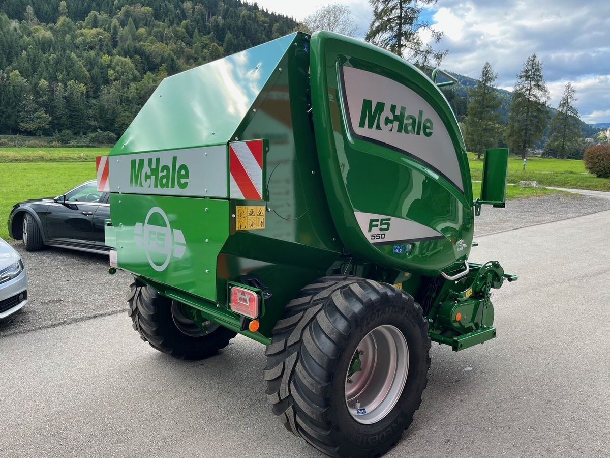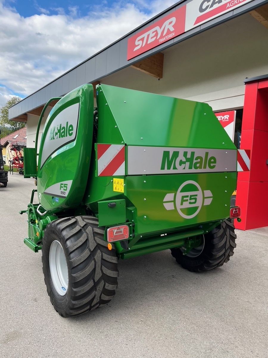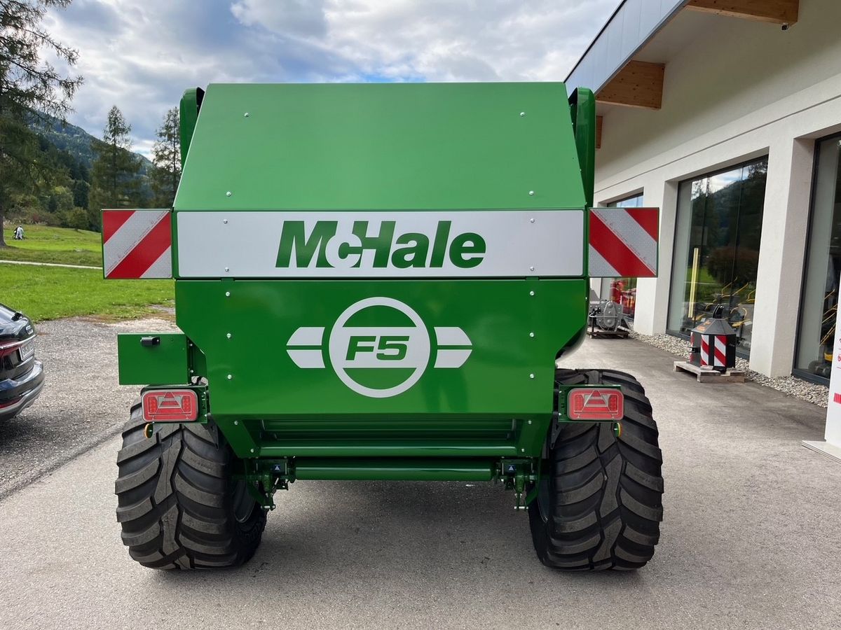 McHale F5-550 Rundballenpresse mit fester Ballenkammer, IControl 5 Bedienmonitor für halbautomatische und manuelle Bedienung, 18 verstärkten Presswalzen, hydraulisches Schwenkbodensystem, Vario - Netzbindungssystem mit einstellbarer Netzvorstreckung, Presskammer Durchmesser 125 cm, automatisch progressive Lagerschmierung, Ballenkammerverfüllung durch Hochleistungs-Rotor 540 mm, Pickupbreite: 2,10 m, 2-Leiter Druckluftbremse, 25 Messer Schneidwerk mit Gruppenschaltung, 6-reihige ungesteuerte Pickup flexibel, verstärkte Gelenkwelle Power Drive für Getriebe 540 U/min, Ballenablagerolle, Spring Tine Rollenniederhalter, Kamera für Ballenablage, Kameramonitor, Bereifung: 560/45 R 22,5