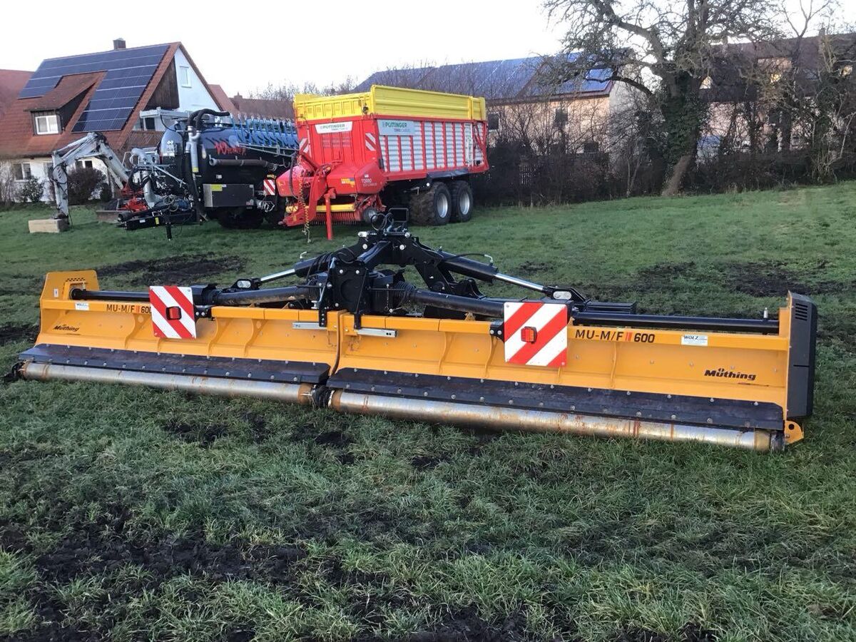 Beleuchtung/Warntafeln, Höhenverstellung, Heckanbau ________ Mietmaschine am Standort Burgbernheim (Pointweg 7, 91593 Burgbernheim, Tel. 09843-1204) MÜTHING - HECKMULCHER MU-M/F600V-HFWDR-46.01 seit 09/2024 im Mietpark eingesetzt - ca. 290 Bh (Stand 12/2025) - Arbeitsbreite 600 cm - 2 Mulchkörper mit 3 m Arbeitsbreite hydraulisch geklappt (2 x einfachwirkend erforderlich) - Dreipunktanbau Kat. III - Einfachbock fest - Abstellstützen - Verschleißeinlage in den Gehäusen - Transportverriegelung in 90° Stellung - schraubbare Hardox Verschleißkufen mit Teilungseffekt - Warntafeln mit LED-Beleuchtung inkl. Blinkerausfallkontrolle und Beleuchtungsträger - hochvergütete Pendelschutzklappen aus Federstahl - Antriebsdrehzahl 1000 U/min, Drehrichtung rechts - Freilauf im Getriebe - automatische Keilriemenspannung - Rotor mit M-Hammerschlegeln DuraX - schraubbare Kurzhäckselleiste "Haifischflosse" - Stützwalze - Abstreiferschiene für Stützwalze - Gelenkwelle - Verstärkung der Verschleißeinlage - Klemmleiste optional: Betriebsstundenzähler