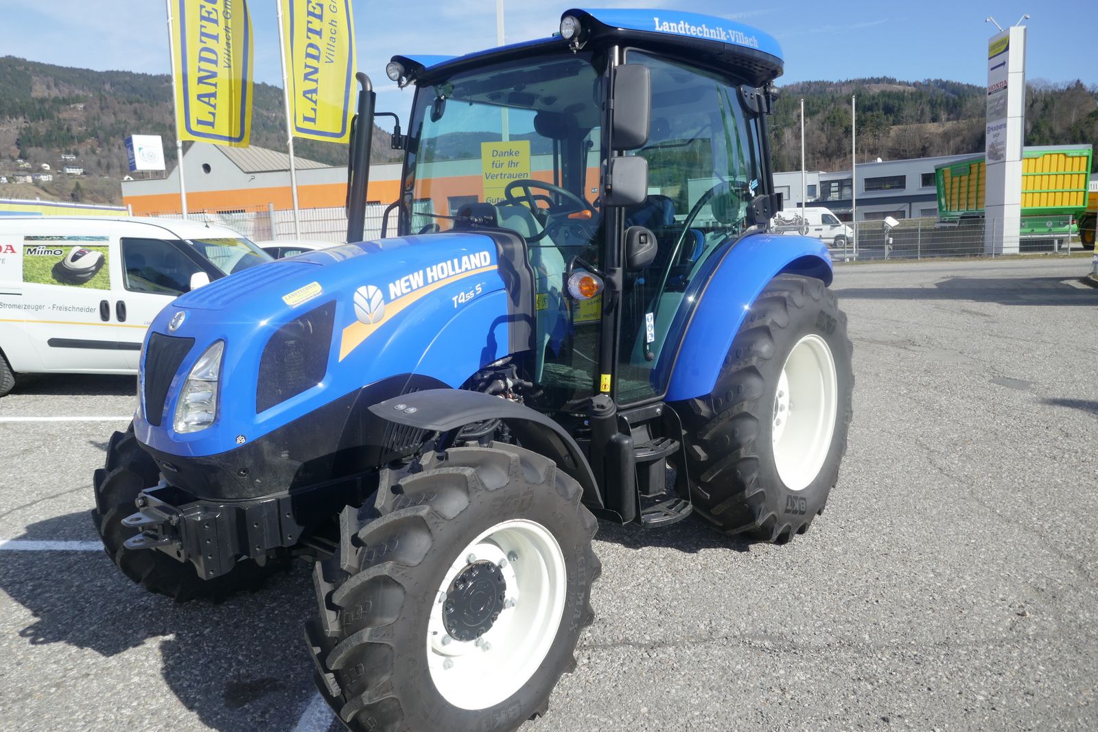 New Holland T4S.55, mit FPT Motor, 40 km/H, 12/12 Wendegetriebe, Lastschaltbare Zapfwelle 540/540E, 2 DW Steuergeräte mit Deluxe Kupplungen hinten, Bereifung: 420/70-28 und 320/70-20, Komfortkabine mit Heizung, Lüftung, Dachfenster, Luftsitz, Beifahrersitz, Radio, verstellbares Lenkrad, Lichtpaket, Ausstellungsmaschine, prompt verfügbar.