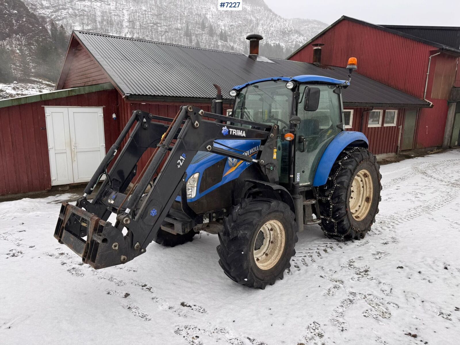 == Mer informasjon (NO) == mascus_category: tractors Please provide reference number upon request: 7227 See en.landbrukssalg.no/7227 for more images Specifications 40 km/h 2 seats Curb weight: 3605 kg Brake valve 3 double hydraulic take-offs Air conditioning/climate Front loader: Trima 2.1P Tire size front: 380/70 R20 Rear tire size: 480/70 R30 Twin wheels attach to the rear wheels Watch video Description New Holland T4.95 with front loader for sale The front tires are worn and the handbrake is a bit awkward Chains hydraulic top link and HMV frame are not included It comes with a mechanical top brace Ready for delivery