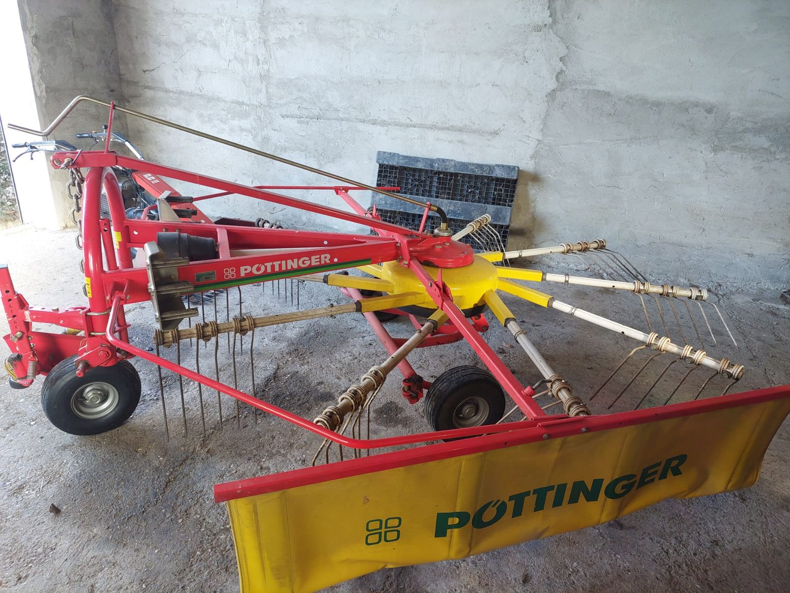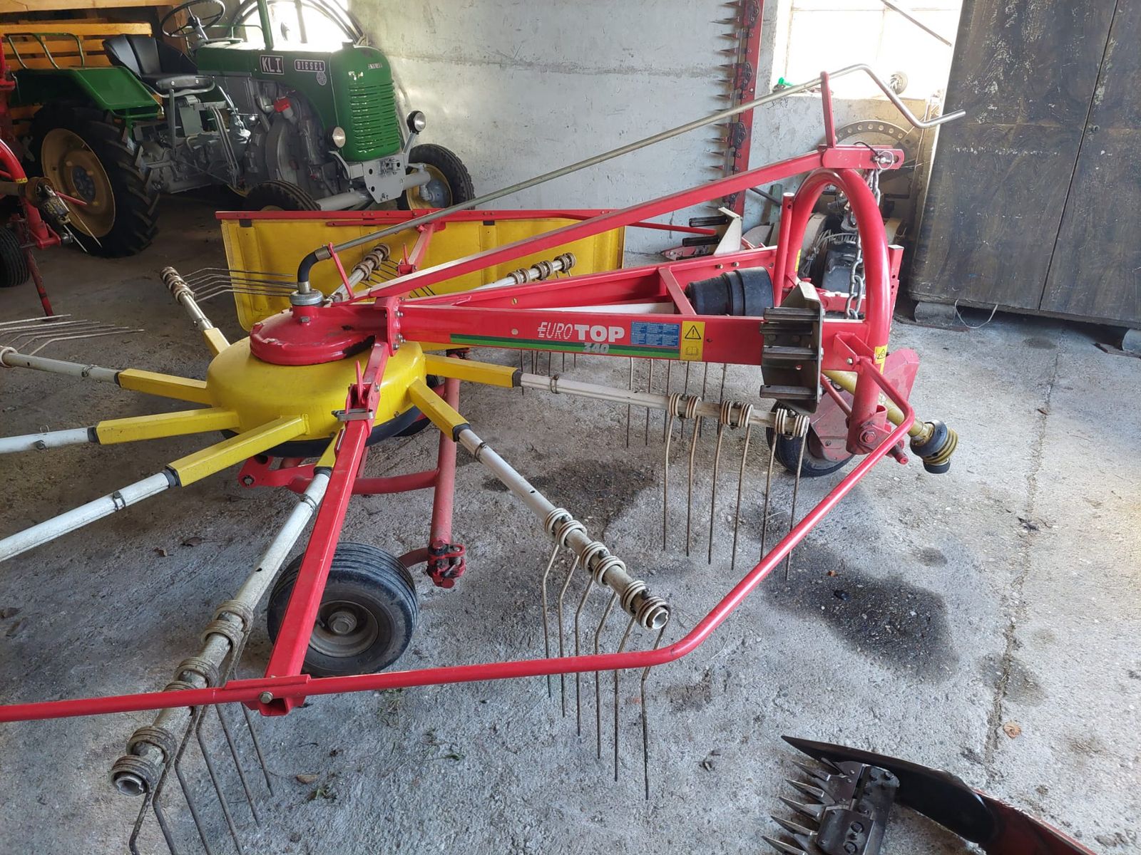 Sehr schöner Pöttinger Schwader EUROTOP 340 mit 10 Armen und 3 Zinken, Einachs, Tastrad, Schwadtuch, Gelenkwelle und Starren Anbaubock