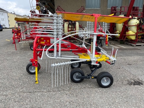 3-Punkt Schwenkbock Kat. 2, 10 abnehmbare Arme à je 4 Zinken, Tandembereifung 16x6.5-8, Beleuchtung und Warntafeln, wahlweise zusätzlich mit Tastrad, Dämpfungsstreben oder hydr. SchwadtuchschwenkungArbeitsbreite 3,40m, Kreiseldurchmesser 2.8m, Transportbreite 1,95m, Gewicht:474