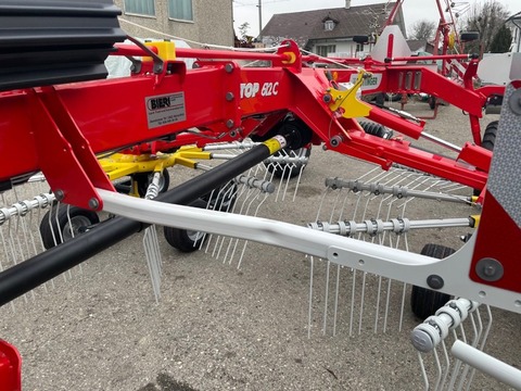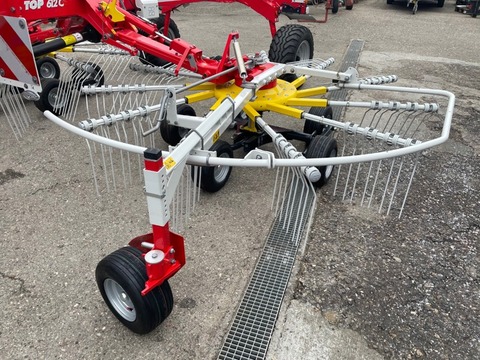Doppel-Kreiselschwader mit MittelablageTOPTECH Plus Kreiseleinheit mit 11 Zinkenträger à 4 Doppelzinken, elektrohydraulische Einkreiselbedienung inkl. Mengenteiler, gelenkter Fahrrahmen, 3-Rad Tandemfahrwerk mit Bereifung 16x6.5 - 8", Fronttasträder "Multitast", Bereifung Fahrwerk 340/55-16 Flotation, Weitwinkelgelenkwelle, Warntafeln und BeleuchtungArbeitsbreite 5.9m, Transportbreite 2.55m, Transporthöhe 3.52, Gewicht:1470