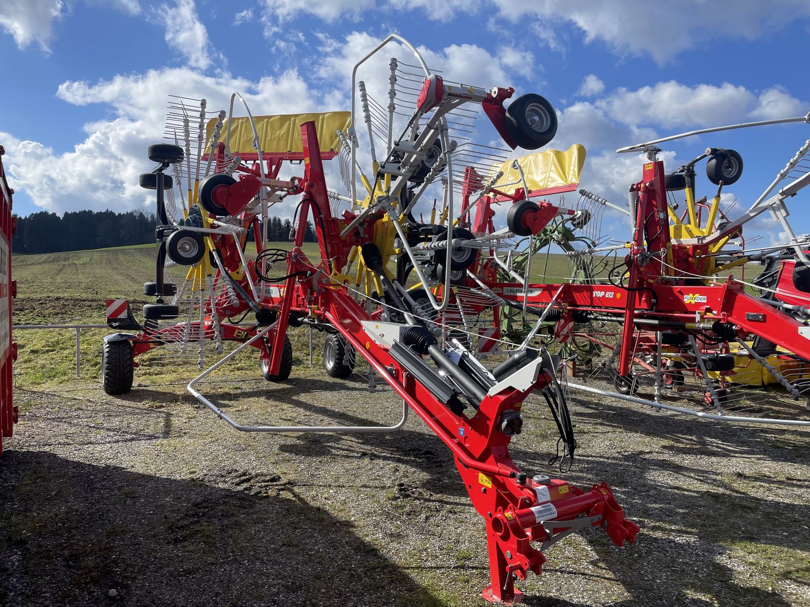 Neue Seitenschwader Baureihe!! mit einseitiger Weitwinkelgelenkwelle 1 3/8" 6-teilig mit Anhängung Kat. 2 mit Fahrrahmen mit einer Transportbreite von 2,9m mit Bereifung 340/55-16 mit 5-Rad Kreiselfahrwerk mit Tandemachsen mit Bereifung 16x6,5-8 mit mech. Höhenverstellung mit Arbeitsbreitenverstellung starr mit außenliegende Tasträder für Multitast mit Warntafel mit Beleuchtung