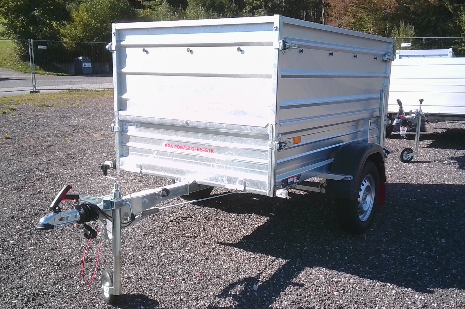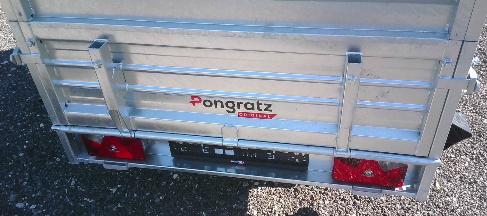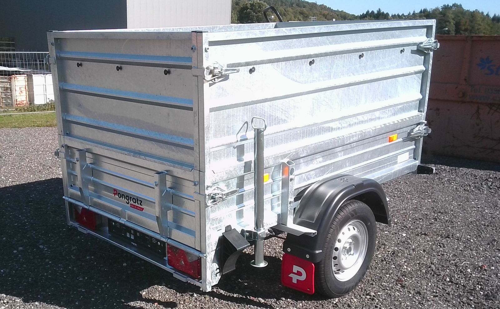 PKW Anhänger der Marke Pongratz, mit 1000kg Gesamtgewicht, robuster vollverzinkter, geschweißter Aufbau, hintere Grundbordwand mit Rohrschanier für besondere Stabilität und Langlebigkeit, Stützrad, Unterlegskeile, Aufsatzwände 600mm zu EPA 206/12, Flachplane, Rohr-Abstellstützen 700mm, Planenknöpfe für Flachplane,