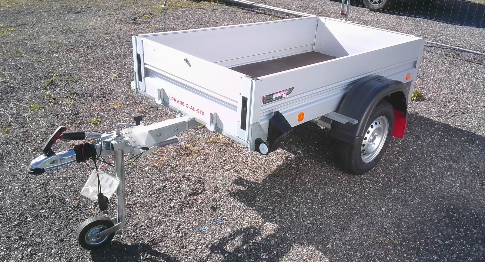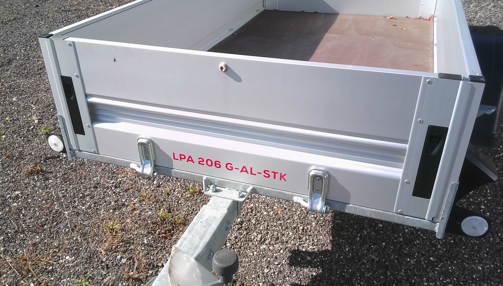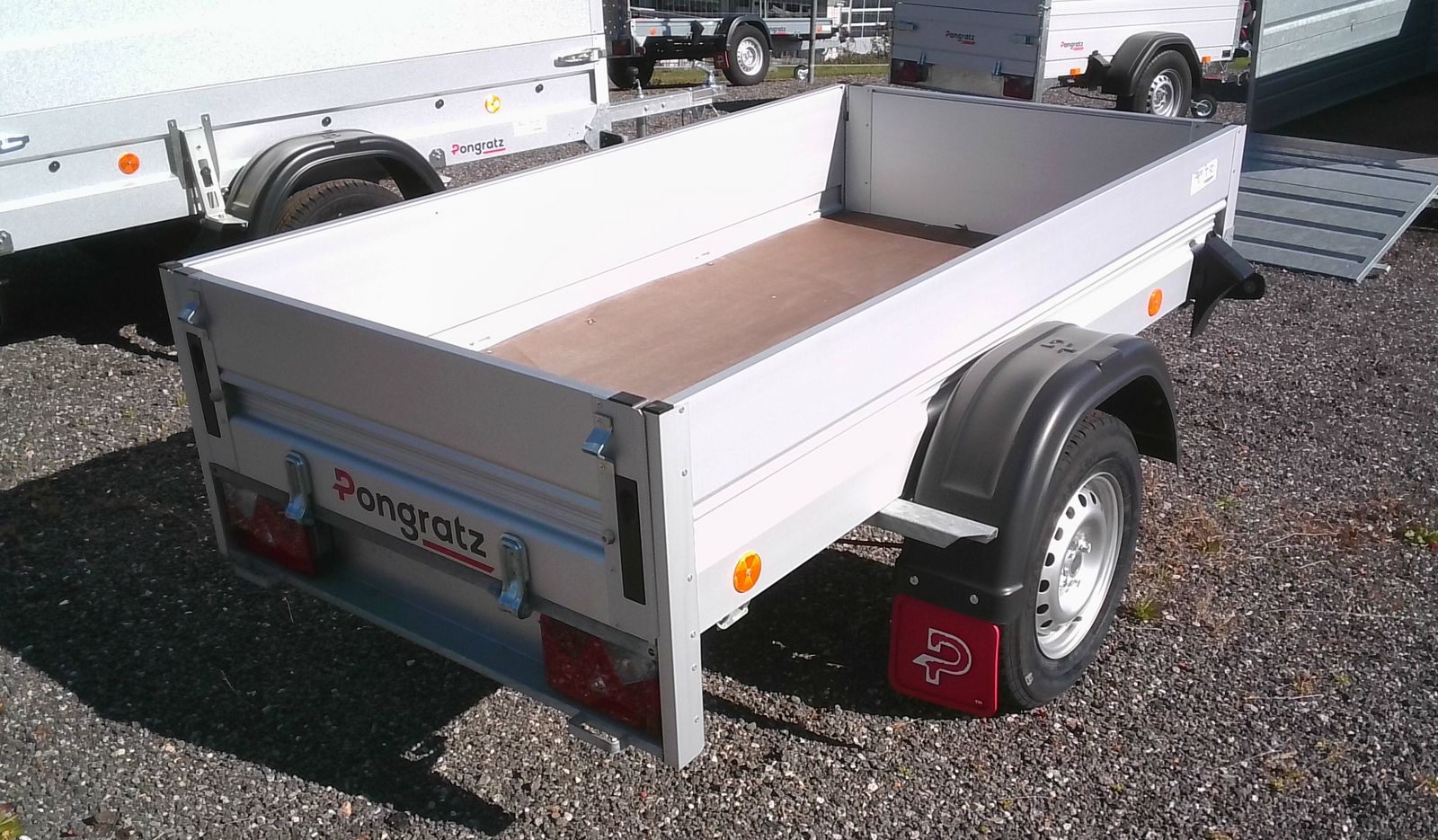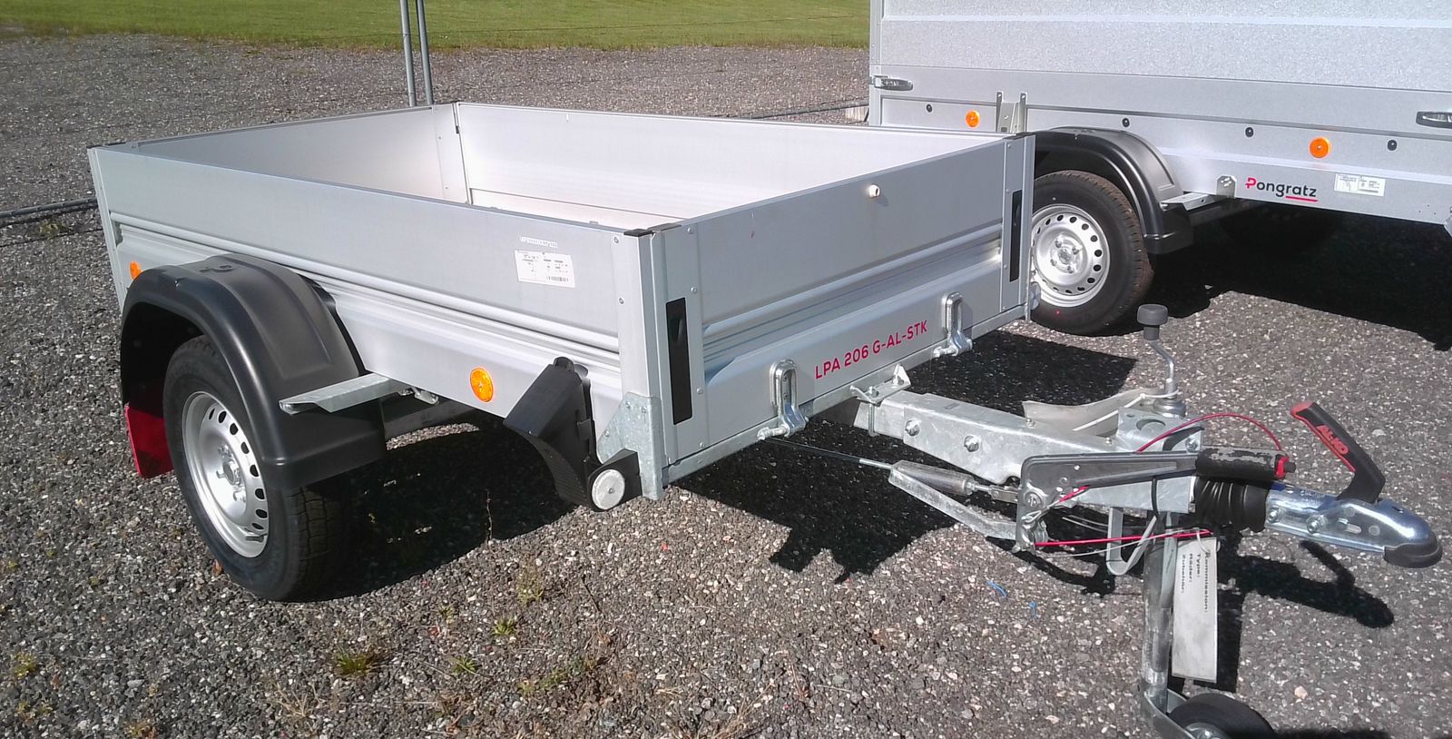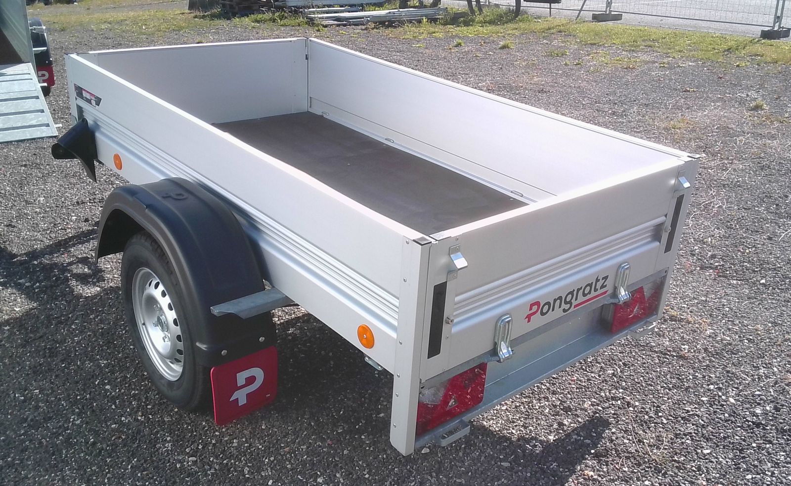 Pongratz Pkw Anhänger mit Aluminiumaufbau, durchgehender Deichsel, auflaufgebremst mit 1000kg Gesamtgewicht, Stützrad montiert, Typenschein, Ausstellungs-Anhänger mit Innenmaße 2010#1075#360mm. Stirnwand klappbar,