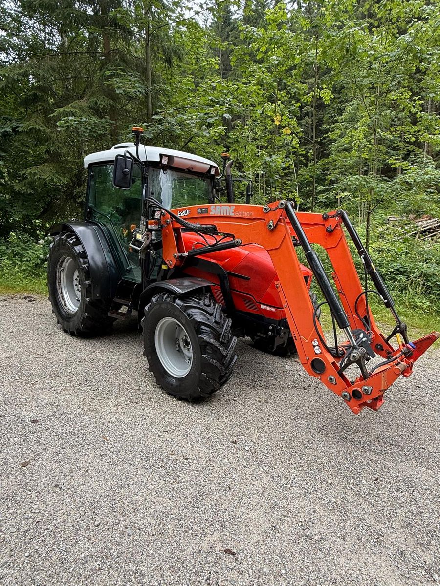 ein schöner Gebrauchter Same Dorado 3. 90 Motor 4 Zylinder mit 95 Ps, 4 Liter Hubraum Mechanisches Schaltgetriebe mit 3 Lastschaltstufen 3x Steuergeräte hinten Doppelwirkend, Rücklauf 2x Steuergeräte für Frontlader mit mechanischen Kreuzhebel Kabine mit Heizung, Klimaanlage, 6 Led Arbeitsscheinwerfer Same Frontlader mit Euroaufnahme und 3 Doppelwirkende Funktion Schlauchkuppler Neuwertige Zwillingräder 320/85R36