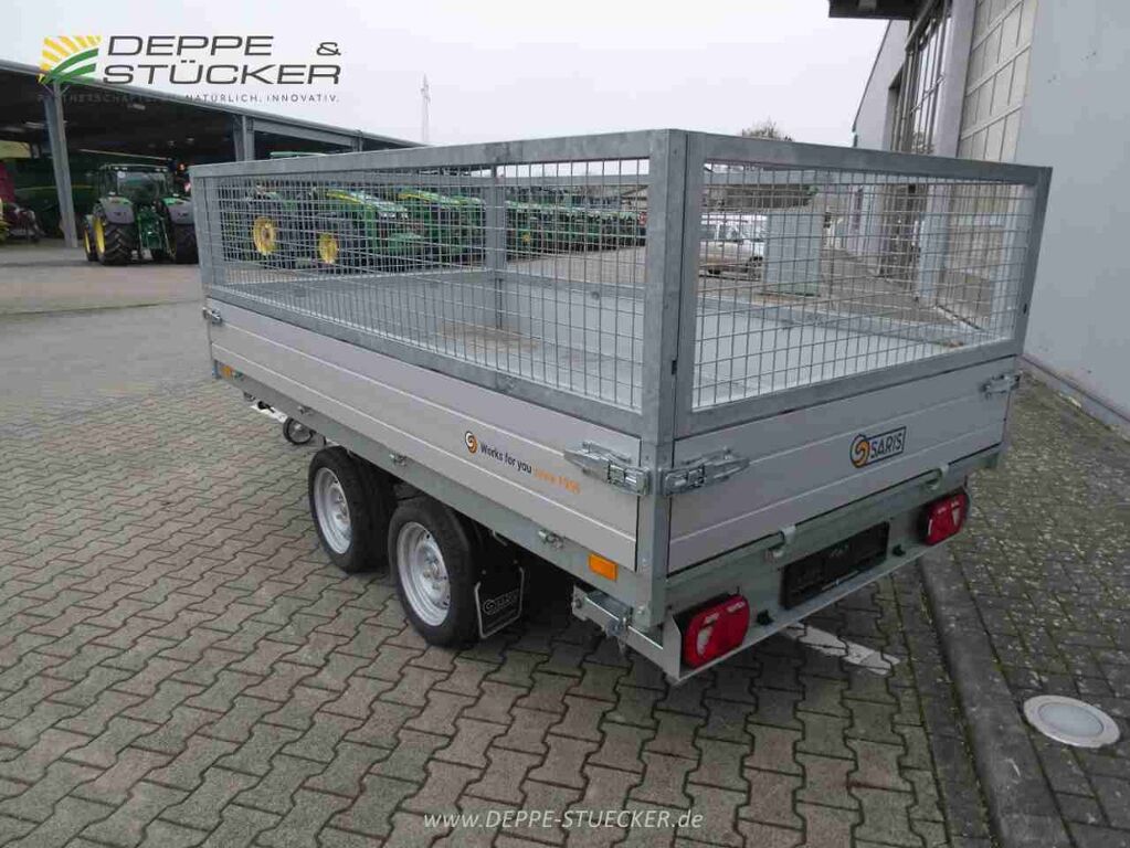 1 gebrauchter Saris PKW Anhänger, Dreiseitenkipper, Typ K3, Ladeflache 306cm x 170cm, Bordwände 30cm, Ladehöhe 75cm, Gesamtlänge 461cm, Gesamtbreite 183cm, Gesamtgewicht 2700kg, Leergewicht ca. 694kg, Reifengröße 195/50R13C, Tandemachse, V-Deichsel, Kippwinkel rückwärts 49grad seitwärts 38grad, Handpumpe, Laubgitteraufbau, Stützfüße hinten, Saris Safety Auffahrrampen, Schwerlast Automatik Stützrad, Zurrpunkte 800daN, Stahltplatte auf Holzboden.
