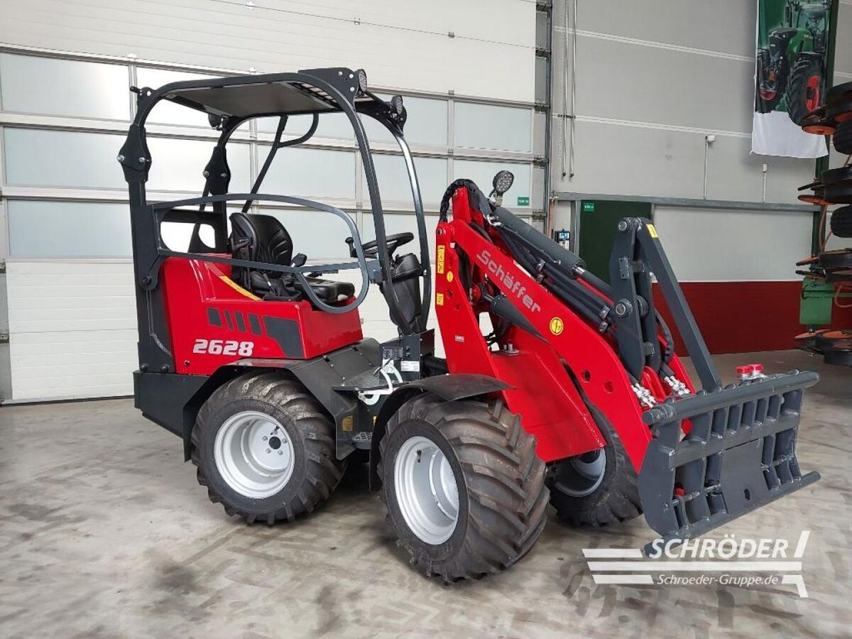 ROPS-Fahrerschutzdach, , Technische Daten Schäffer 2628:, Leistung: 18,5 kW (25 PS), Betriebsgewicht: 1.850 kg, Geschwindigkeit: 20 km/h, Länge mit Standardschaufel: 3.550 mm, Breite: 1.060 - 1.260 mm, Höhe mit Fahrerschutzdach: 2.200 mm, Wenderadius: 820 mm, Hubhöhe (WZ-Drehpunkt): 2.800 mm, optional: 3.110 mm, Hubkraft: 1.600 kg, Kipplast gerade (Palettengabel): 789 - 941 kg, Kipplast gerade (Schaufel): 1.041 – 1.191 kg, , Serienausstattung Schäffer 2628:, 3-Zylinder-Dieselmotor Kubota D1105, hydrostatischer Allradantrieb mit automotiver Steuerung, Hochdruck-Antrieb HD-plus, Original Schäffer-Achsen, Kombi-Ölkühler, Trommelbremse als Betriebs- und