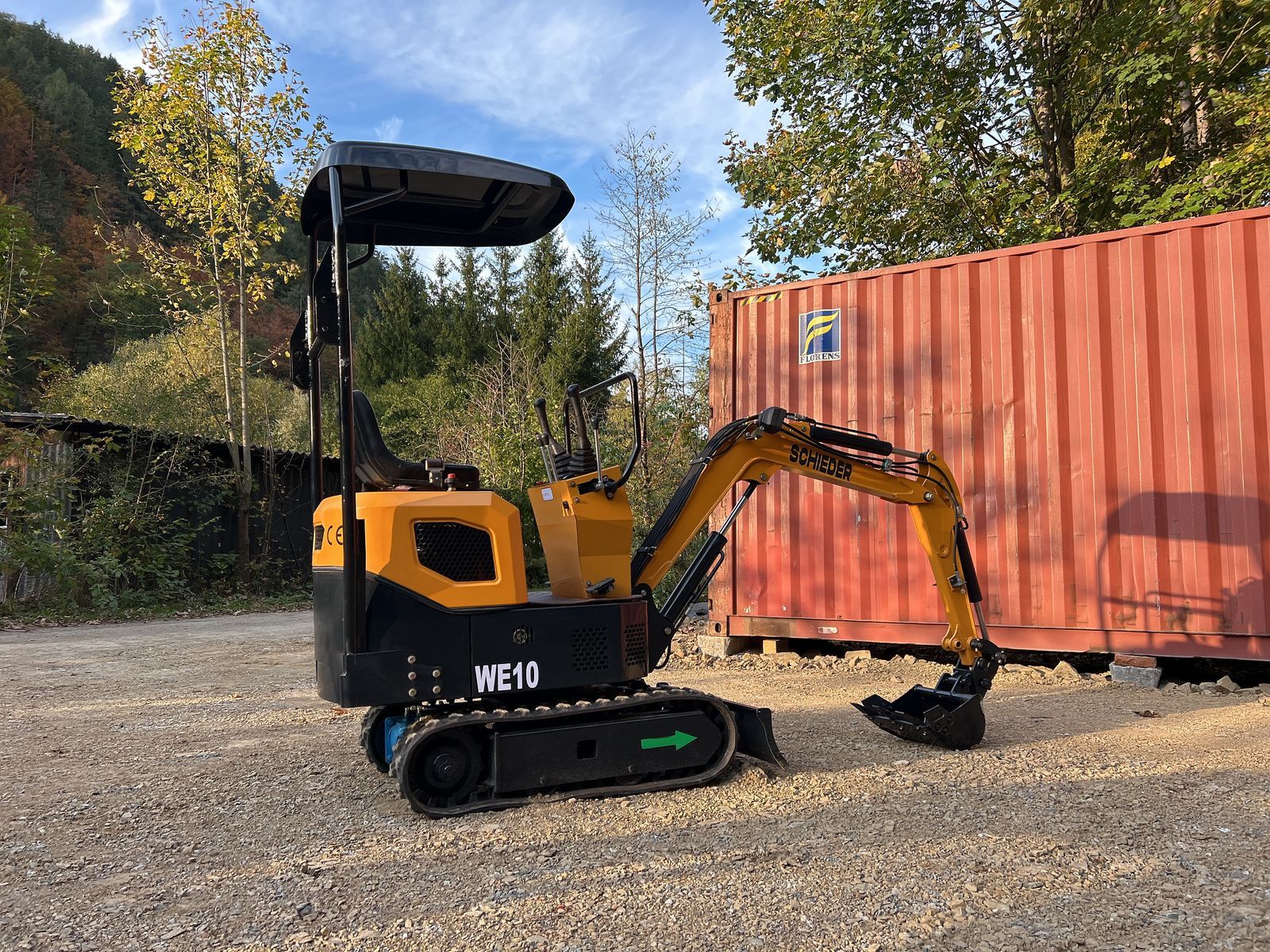 Der Schieder Minibagger WE10 ist klein, leistungsstark und vielseitig einsetzbar. So eignet er sich optimal für Arbeiten in Gebäuden, für kleine Abbrucharbeiten oder für das Anlegen von Bewässerungsanlagen