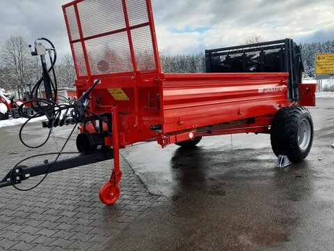Technische Daten: max. Gesamtgewicht: 5000kg Gewicht: 1300kg Tragfähigkeit des Streuers: 3700kg Länge: 5,13m Breite: 2,53m Höhe: 2,32m Bordwandhöhe: 0,50m Pritschenmaße: 3,2x1,6m Ladevermögen: 2,6m³ - m. Bordwandaufsätzen: 5,2m³ Zulässige Zugösenbelastung: 1000kg Erforderliche Traktorleistung: 29PS/ 40kW Antrieb: 540 U/min Spurbreite: 2,07m Bereifung: 15,0/55x17-AW profil Streuwerk: 4 vertikale Streuwalzen Bordwände: aus Stahl - abnehmbar Streuwerkshaube: hydraulisch Kratzbodenkette: 2 Ketten 10x31mm Anhängung: Zugdeichsel mit Auflaufbremse und Rückfahrautomatik für eine Geschwindigkeit von 25 km/h Gelenkwelle: Weitwinkelgelenkwelle mit Überlastsicherung 900Nm hydraulischer Kratzbodenantrieb automatische Kettenspannung