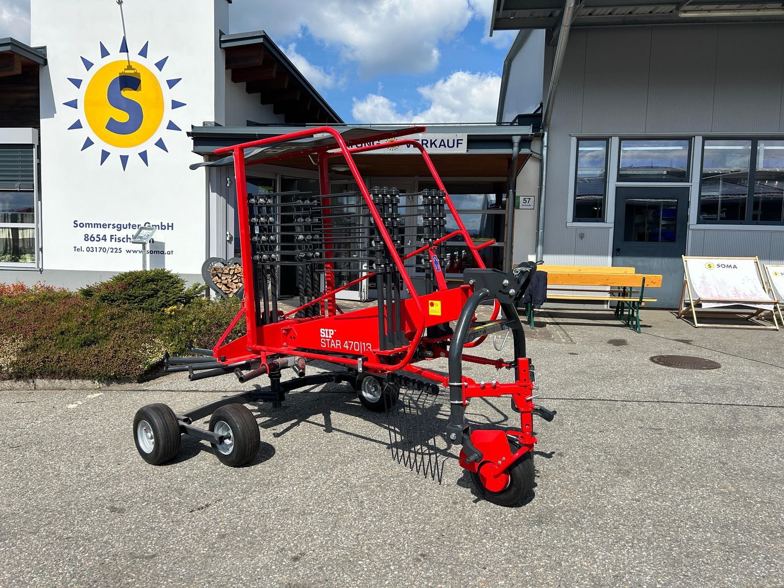 SIP STAR 470/13 Kreiselschwader mit 13 Zinkenarmen, jeweils vier Doppelzinken pro Zinkenarm, Kreiseldurchmesser 3,56m, Arbeitsbreite gesamt ca. 4,7m, alle Zinken einzeln abnehmbar, die Zinkenhalterungen sind einzeln verschraubt und können bei Beschädigung auch einzeln ausgetauscht werden, ab ca. 30 PS, einfache Höhenverstellung via Kurbelsystem, serienmäßiges Tandemfahrwerk, auch mit Tastrad erhältlich (optional). Der Einkreiselschwader STAR mit vier Doppel-Federzinken pro Zinkenarm, modulare Kreiselausführung und Serienmäßig mit Tandemfahrwerk. Die modulare Kreiselausführung mit einzeln abnehmbaren Zinkenarmträgern. Robuster Schwenkbock für ein optimales folgen des Traktors. Beim Ausheben wird die Maschine automatisch zur Mitte zentriert. Die Höhe wird über eine Kurbel eingestellt. Das OPTIONAL erhältliche Tastrad (+400.-) verbessert die Bodenanpassung. Wir freuen uns auf Ihren Besuch. Ihr SOMA-Verkaufsteam