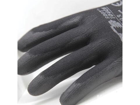 sömlös stickad handske i nylon som är doppad i svart PU i innerhand och över fingertopparna