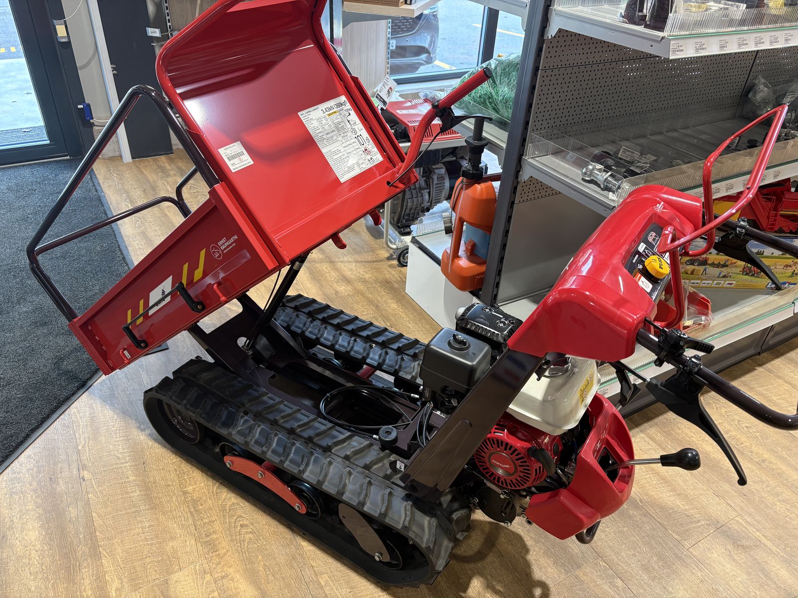 Listenpreis 4 600 inkl. MwSt Motor Honda GX 120, 4-Takt, luftgekühlt Leistung 3.2 kW / 4.3 PS Geschwindigkeit V: 0.6 – 5.0 km/h R: 0.6 – 2.3 km/h Getriebe 8 Gänge (6 V + 2 R) Nutzlast 350 kg Kippvorrichtung pneumatisch unterstützt Raupenbreite 180 mm Spurbreite 440 mm Abmessungen 1655 x 625 x 1020 mm Ladefläche 950–1110 x 520–900 x 150 mm Gewicht 190 kg
