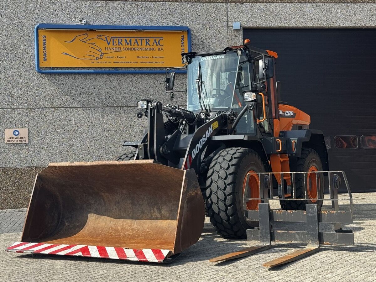 == More details (EN) == Cab Very nice Develon / Doosan DL200-7 2022 4-speed powershift quick-change system joystick air-suspended seat Doosan Connect Start/Stop system tyres: 20.5R25 BridgestoneComplete with 1.9m3 bucket with ride protection and pallet fork**LEASE POSSIBLE THROUGHOUT EUROPE!! ** We are open from Monday to Friday from 7.30 a.m. to 12 noon and from 1 p.m. to 5.30 p.m. If you would like to visit us outside office hours please contact us to make an appointmentDelivery to your location is no problem. We can also give assistance in organizing the relevant importation documents if necessary.We can also supply new and second hand accessories/parts such as tow bars tyres and wheel rims.We have made every effort to give you accurate and up-to-date information. Mistakes are however human and not always preventable. Model and specification mistakes can be made so we advise you to check these at all times