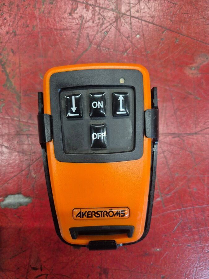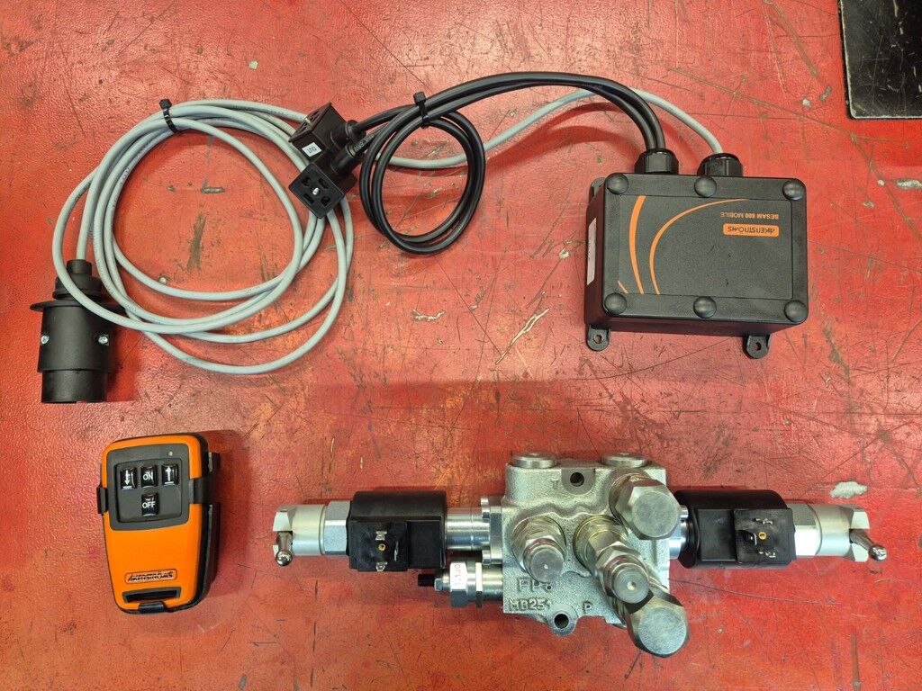 2-Kanal Funksteuerungssatz für hydraulisch angetriebene Winden, Ölmotore oder Hydraulikzylinder mit 12 Volt Monoblock VentilDer Funk ist mit einem 7-poligem KFZ-Stecker ausgerüstet, das Elektromagnetventil ist doppeltwirkend und verfügt über einen Anschluss zur Druckweiterführung, die Anschlüsse zu den Arbeitszylindern sind in der Null-Stellung gesperrt Keine Schwimmstellung in der Null-Stellung!Technische Daten:12 V 3 ADurchfluss max. 50 L/min.Betriebsdruck: max. 175 barAnschlüsse: 1/2 Zoll IG Ein- /Ausgang und Verbraucher, 1/2 Zoll AG zur DruckweiterführungSteuerventil mit zusätzlicher manueller Not-Bedienung.Funkfernsteuerung Akerströms S800 Empfänger (Neuwert 589.–)Funkfernbedienung Akerströms S800 Sender (Neuwert 189.–)Steuerventil FAIE
