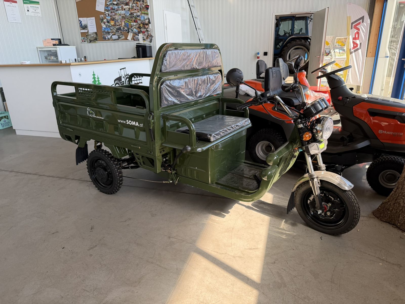 E-Lastenrad mit kippbarer Ladebrücke führerscheinfrei Lastenfahrrad mit Batterieantrieb und kippbarer Ladebrücke. Führerscheinfrei, anmeldefrei - gilt als Fahrrad Maximale Höchstgeschwindigkeit: 25 km/h (durch elektronische Begrenzung) Maximale Antriebsleistung: 1000 Watt (durch elektronische Begrenzung) Bürstenloser Gleichstrommotor Batterie 60V / 45 AH Blei-Akku Maximal zulässiges Ladegewicht: 300 kg (inkl. Fahrer) Abmessungen: L = 2780 / B = 1000 / H = 1370 mm Ladeflächengröße: L = 1300 / B = 1000 mm Dreirad Differentialgetriebe hinten Trommelbremssystem – hinten Scheibenbremse vorne 1 Sitzbank optional Bereifung Stoppelreifen für Geländefahrten auf Antriebsachse Fahrradbeleuchtung: Scheinwerferlampe vorne Rücklicht, optische Blinkeranlage Signal/Hupe
