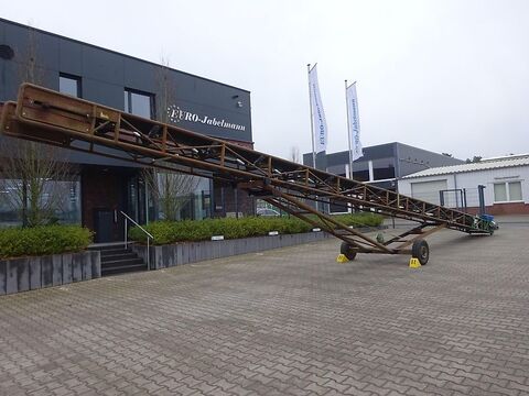 GEBRAUCHTMASCHINE: Gebr. Muldenförderband, 15,50 m lang Stollengurt Gurtbreite 650 mm mit Bandabstreifer Stollenhöhe 15 mm Aufsteck-Getriebemotor 3 kw, NEU Ein/Aus Schalter, NEU Gummierte Antriebsrolle unten, NEU Bandgeschwindigkeit ca. 79 m/min Einlauftrichter, NEU Alle Laufrollen, 39 + 7, NEU Fahrgestell mit Luftbereifung Höhenverstellung mit Winde, NEU Maximale Überladehöhe ca. 7 - 8 m Gewicht ca. 1100 kg TOP-Zustand Gegen Mehrpreis: Frequenzregler für stufenlose Geschwindigkeitsverstellung Anlieferung gegen Mehrpreis möglich.