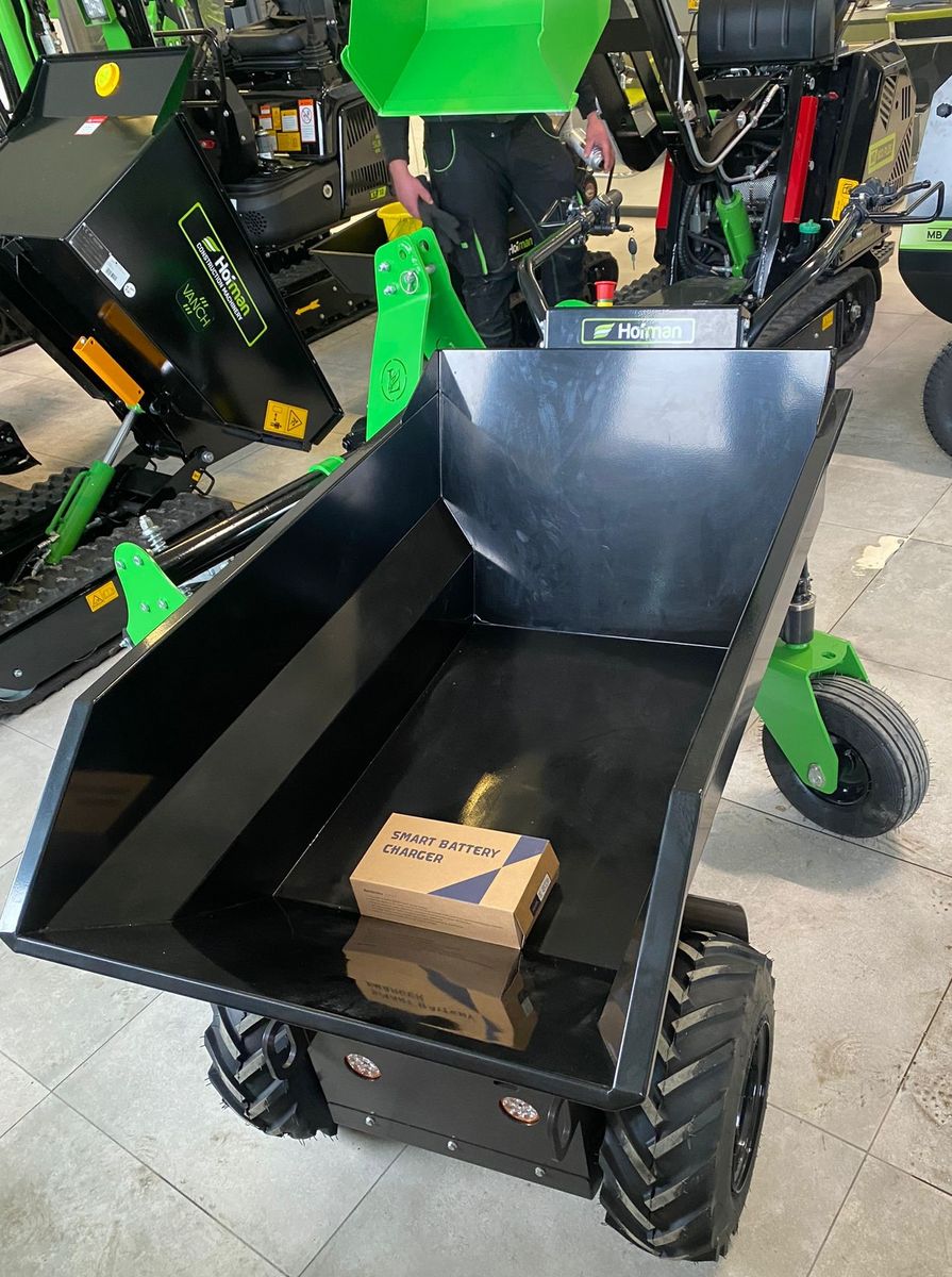 4 breite Gummiräder: 2 Vorderräder: Schlauchlose Bereifung: 16x6,5-8 2 Hinterräder: Schlauchlose Bereifung: 13x5.00-6 Die Vorderräder sind Antriebsräder, während die 2 Hinterräder schwenkbar sind und Stabilität und einfaches Manövrieren auf engstem Raum garantieren. Die Hinterräder sind mit einem Stift ausgestattet, um sie in gerader Position zu arretieren. Die Breite ihrer Lauffläche reduziert die Möglichkeit der Bildung von Spurrillen auf dem Boden erheblich. 4 Batterien für große Autonomie: Die elektrische Schubkarre wird mit 4*12V / 32Ah-Bleibatterien für eine Autonomie von ca. 7 Stunden je nach Verwendungsart geliefert. Das Aufladen erfolgt durch Anschließen des Ladegeräts an die Steckdose zu Hause. Die Ladezeiten betragen ca. 7 Stunden für 100 %. Stahlkippmulde: Sehr robust, mit parallelen Verstärkungen auf der Unterseite. Ermöglicht auch das Laden von sandigen Materialien oder Flüssigkeiten ohne Auslaufen. Die Mulde kann vertikal um 90° gekippt werden, was eine vollständige Entleerung des transportierten Materials ermöglicht. Einfaches Bedienfeld: Zündschlüssel Batterieabschaltung Taste für 3 Vorwärtsgänge: niedrig, mittel, schnell + 1 Rückwärtsgang LED-Taste für hohe Geschwindigkeit Taste für niedriges LED-Scheinwerferlicht Taste für Vorwärts-/Rückwärtsfahrt LCD-Display mit prozentualer Anzeige der Batterieladung EIGENSCHAFTEN UND SPEZIFIKATIONEN Elektromotor: 1000 W, 48V Bremssystem: Elektromagnetische Bremse Batterien: Blei-Säure 48V 32Ah LED-Leuchten: 2 x 30W Nutzdauer :ca. 7-8 Stunden Ladezeit: 6-7 Stunden bis zur 100%igen Aufladung Fahrgeschwindigkeit: Schnell: 5,0 km/h - Mittel: 4,2 km/h - Niedrig: 3,3 km/h Rückwärtsgeschwindigkeit: 2,5 km/h Tragfähigkeit: 500 kg