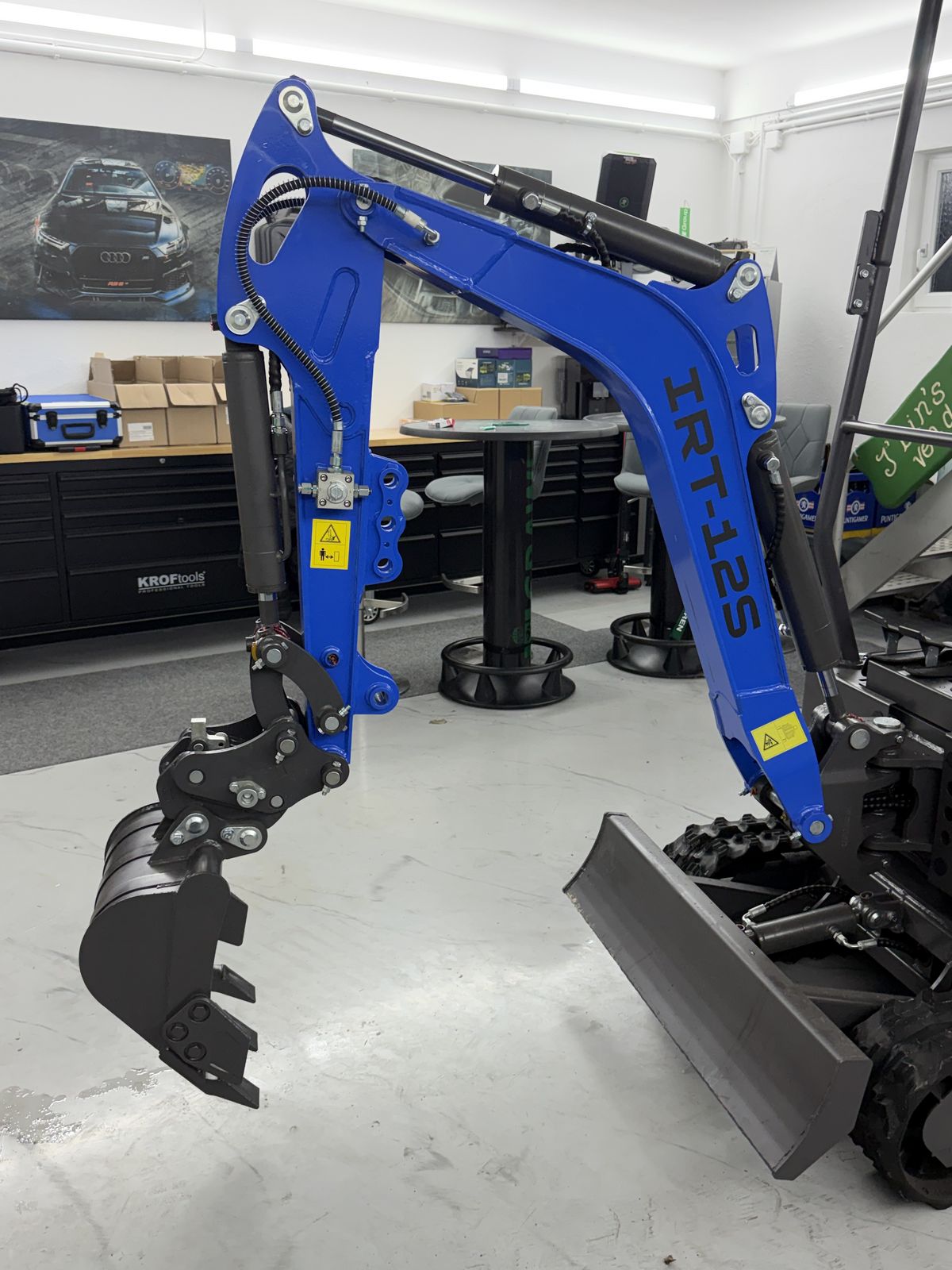 Minibagger IRT12S – 1200kg Der IRT-12 ist ein leistungsstarker 1,2-t-Minibagger für Profis auf anspruchsvollen Baustellen und für präzise Arbeiten in beengten Bereichen. Der KOOP‑Dieselmotor KD192F (7,6 kW) mit zwei Volumenströmen (21,6 + 10,8 l/min) bei 16 MPa Arbeitsdruck liefert eine hohe Hydraulikleistung. Mit seinem kleinen Schwenkradius (1.190 mm) überzeugt er insbesondere in urbanen Umgebungen. Inklusive GRATIS: 40‑cm Grabenschaufel + Schnellwechsler
