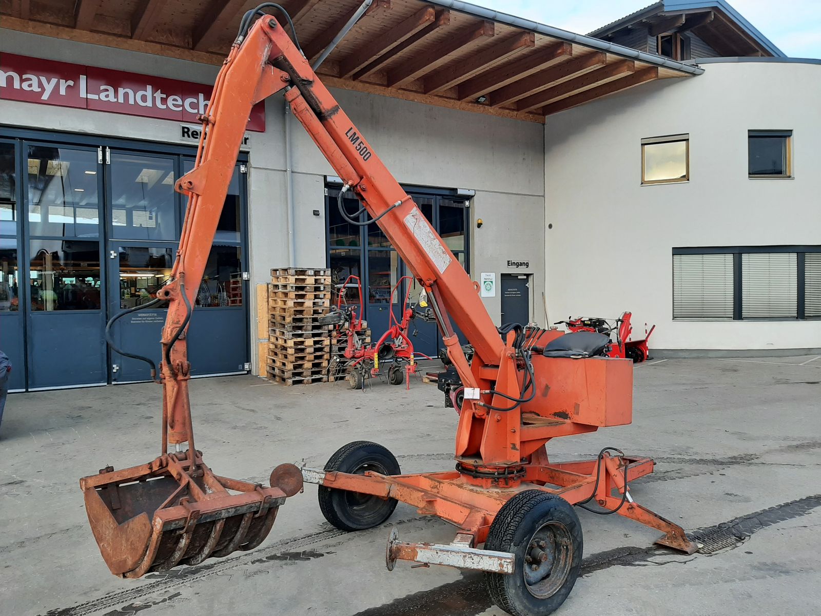 + 1 Achse + 2 Stützen mechanisch + 2 Klappstützfüße hydraulisch + Anhängedeichsel + Antrieb mit Benzinmotor + Klaviersteuerung + Mistgreifer mit ca. 60 cm Breite inkl. Mistschaufeln + Reichweite ca. 4,3 m max ausgefahren + Breite bei den Rädern ca. 195 cm