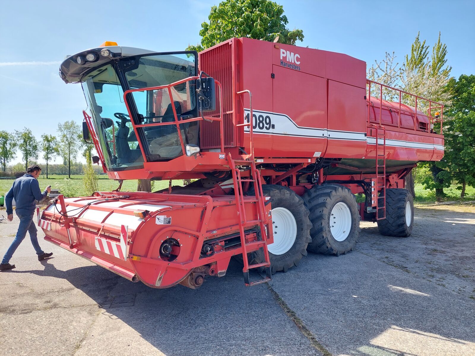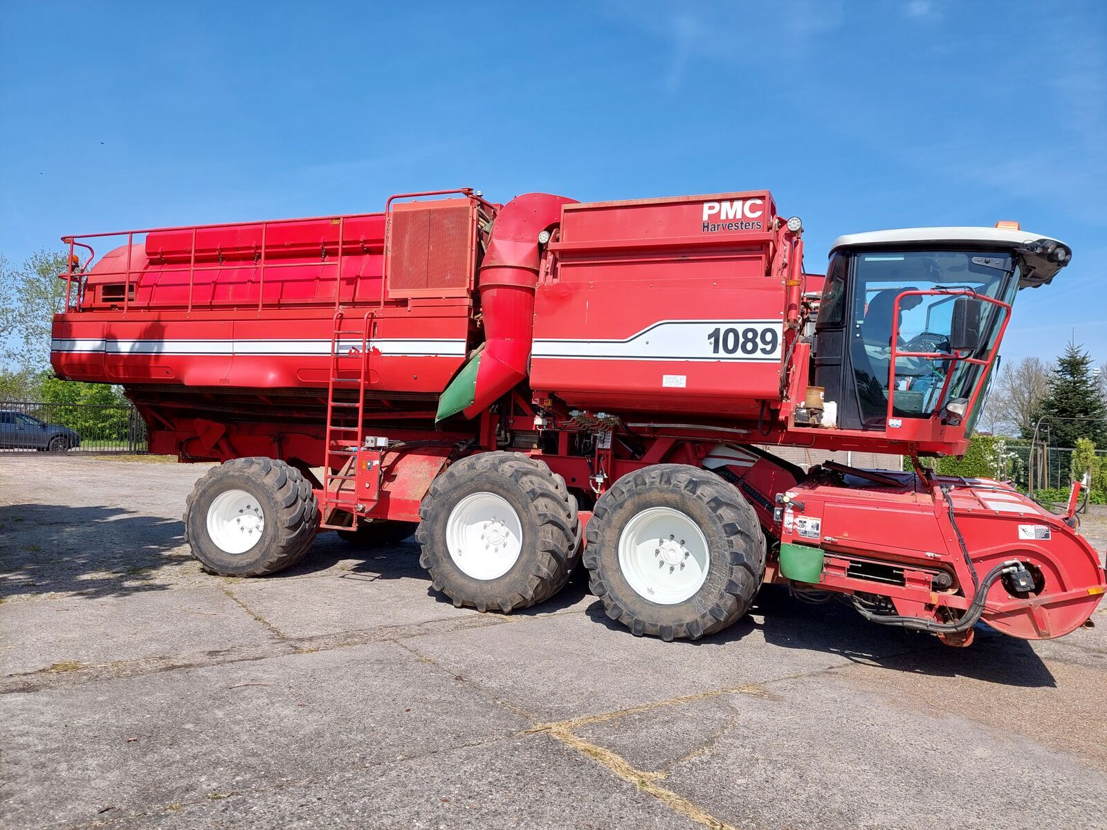 == Overige details (NL) == - liquid cooled, turbo charged, intercooled, diesel engine developing 331kW (444hp) at 1450 rpm (Rating ICFN), - air blown oil coolers for hydraulic and hydrostatic circuits, - centralised hydraulic pump drive gearbox, - remote controlled hydraulic offloading for disengaging harvesting system, - hydrostatic drive (infinitely variable from 0-24 km/h), - front axle fitted with drive wheels or tracks - option 1, 750/65 - 26 tyres - rear drive wheels fitted with 680/55 - 26.5 tyres for low ground pressure, - electronic anti-slip system fitted to rear axle and front bogie with tyre option, - power steering on rear two wheels, steering assist on front two wheels fitted with 750/65-26 tyres - dynamic braking, - failsafe parking brake, - fully automatic leveling systems, side to side and fore and aft, with manual over riding controls, - centrally mounted driver’s cab with the following features:- - air conditioning - cab heating - adjustable steering column - operator controls and seat - sound insulation - tinted glass - PMC Harvest Vision System HVSt with 10” touchscreen display - picking reel, 3.5mtr or 4.00mtr wide with variable speed hydraulic drive, hydraulic lifting and automatic float control, with side shift feature, front cover with hydraulic adjustment, - driven ground roller with hydraulic height adjustment, - sealed infeed system using high quality P.V.C. coated belts, - threshing system comprising five beater system and threshing drum, - friction driven threshing drum with pressure indicator, - twenty one removable steel frames with stainless steel screens, three screen cleaning brushes, - two inclined P.V.C. coated aprons, both rotating outwards and incorporating a hydraulically driven agitator for efficient trash removal. Aprons adjustable for angle and speed, - 557mm wide long pea conveyor with reversing facility and centre tracking, - hydraulically driven suction fan with variable spee
