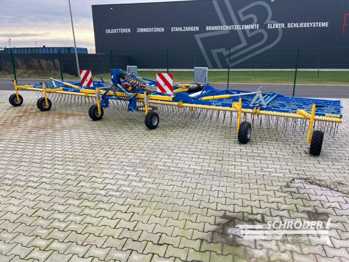 ________ 5-teilig, Arbeitsbreite 9 m (6,20 m, 3,00 m) mit je 10 cm Überlappung, , Maße und Gewichte:, Transportbreite: 2,98 m, Abstellhöhe 2,50 m, Transporthöhe: ca. 3,00 m bei 50 cm Bodenabstand, Gewicht: ca. 1.250 kg, , Serienmäßige Ausrüstung:, stabile, filigrane Rahmenbauweise, Felder: 1x 300 cm, 2x 160 cm, 2x 150 cm, , Klappung:, hydraulische Einklappung der Striegelfelder, mit 4 doppelwirkende Hydraulikzylinder 2x links, 2x rechts, , Striegelzinken:, patentiertes Doppelpendellager-Zinkensystem, Strichabstand 28 mm, Zinken Ø 8 mm, Zinkenlänge 550 mm, Standardzinken 105°, , Zinkendruckverstellung:, manuelle zentrale Zinkendruckverstellung, , Zugfeder A/C:, 2 verschiedene Zugfedern für Zinkendruck zur Auswahl, Feder A (100g und 600g - 5.000g) ist serienmäßig, Feder C (100g-5.000g Kombifeder) gegen Aufpreis, , Stützräder:, 6 Stützräder 16x6.5-8 luftbereift, kugelgelagert, höhenverstellbar, 2 Abstellstützen für Heck, , Zusatzausstattung:, hydraulische patentierte stufenlose Zinkendruckverstellung, Pendelstützrad 16.5x6,50-8/6 73M luftbereift für Querbalken 80x80, Querbalken am Heck zur Spurverstellung 80x80 mm für Spurbreite bis 2,25 m, Warntafelsatz 4-teilig mit LED-Beleuchtung nach hinten und vorne inklusive Halter, 329 Kombifedern, patentiertes Feder in Feder-System 100 g - 5.000 g, stufenlos einstellbar, 329 Zinken 120° mit Hartmetallbeschichtung,