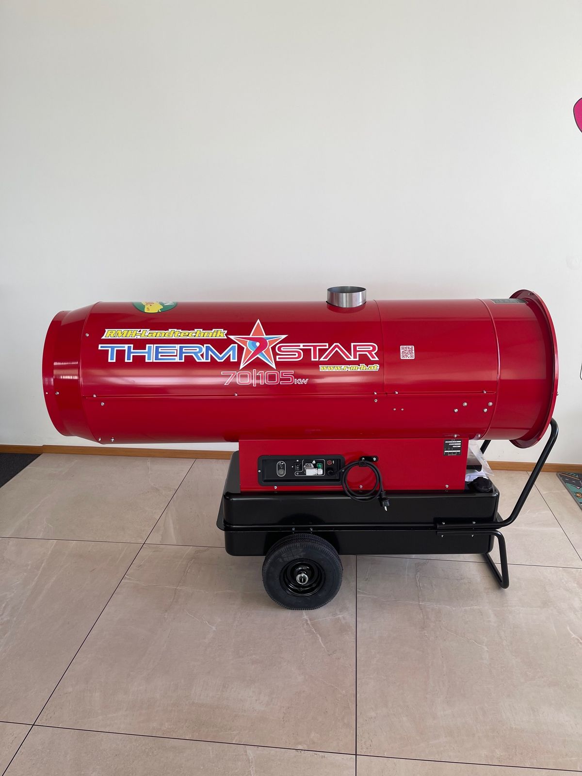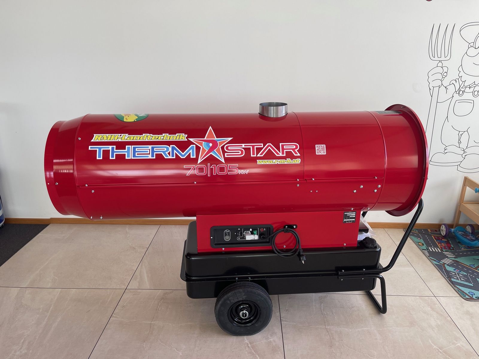 Serienmäßige Ausstattung: • Kraftstofffilter • Tank • Brennkammer aus Edelstahl • 2-Stufiger Brenner • Sicherheitsthermostat bei Übertemperatur • Nachbelüftung zur Brennkammerkühlung • Wirkungsgrad bis zu 93% • Anschluss für Umgebungsthermostat • Geeignet für max. 12 Meter Kanal • Geeignet für geschlossene Umgebungen • Geeignet für Heubelüftung und div. Trocknungen Technische Daten: Anschluss/Frequenz: 230 V~50 Hz Motorleistung Lüfter: 1.820 W Heizleistung: Stufe 1: 71,2kW / 61.235kcal/h Stufe 2 : 105,54kW 90.762 kcal/h Gebläseleistung: 2500m³/h Tankinhalt: 65 l Verbrauch: 6,33-9,3 kg/h Brennstoff: Heizöl oder Winterdiesel Abmessungen L x B x H: 1918 x 731 x 1220mm Gewicht :149kg Heizkanone , Heizung , Frischluftheizgerät , Heizgerät