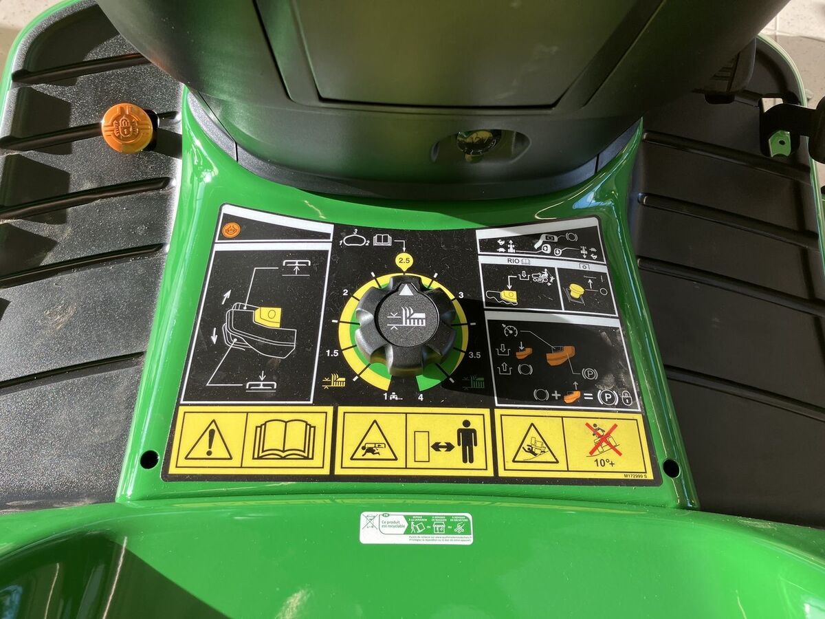 == Overige details (NL) == prijs: Prijs op aanvraag Quantity: 1 Unit: Stuk John Deere X590 Zitmaaiers en tuintrekkers BELANGRIJKSTE SPECIFICATIES Motor - Vermogen Bij 3250 t/min 16.7 kW Motor - Fabrikant/model FS730 EFI Type aandrijflijn K72 hydrostatisch ingebouwd in transmissie Transmissie - Regeling Twin Touch™-pedalen Achterbanden 24x12-12 turf Type hefsysteem Hydraulisch vermogen Maaibreedte 122 137 cm 48 54 in Garantie Olieaftapplug MOTOR Vermogen Bij 3250 t/min 16.7 kW Cilinderinhoud 726 cc 44,3 cu in Fabrikant/model FS730 EFI Type Elektronische brandstofinjectie (EFI) Overhead-klep (OHV). Volledige druksmering oliefilter Cilinders V-twin gietijzeren bussen Regelaar Elektronische handgasregeleenheid constante snelheid Gasklep/toerentalregelaar EFI geen gashendel vereist Koelmethode Lucht Luchtfilter Droog vervangbaar met schuimvoorreiniger Olieaftapplug Olie aftappen zonder gereedschap met vervangbaar oliefilter BRANDSTOFSYSTEEM Type Benzine Brandstoftoevoer Elektronische brandstofinjectie (EFI) met open lus Brandstofmeter Meter in dashboard Locatie brandstoftank Achter Brandstofvulopening Op linker spatbord 7,6 cm 3 in Brandstoftankinhoud 16,7 L 4,4 U.S. gal ELEKTRISCH SYSTEEM Accu 12 V 500 CCA Laadsysteem Vliegwieldynamo geregeld 15 amp Startmotor Elektronisch Bedrijfsurenteller Ja Koplampen Twee standaard Achterlichten of reflector Reflectors Achteruitrijlampen Nee Werklampen achter Nee 12V-aansluiting Ja TRANSMISSIE Type K72 hydrostatisch ingebouwd in transmissie Regeling Twin Touch™-pedalen Cruise control Ja op dashboard Oliekoeler Vinnen en ventilator op aandrijfas Oliefilter Ja vervangbaar Differentieelslot Standaard Snelheid vooruitrijden 0-11,6 km/h 0-7,2 mph Snelheid achteruit 0-8,4 km/h 0-5,2 mph Remmen Interne natte schijf CHASSIS Frame Gelast versterkt Lak E-coating/poeder Gewichtsbeugel Standaard voor en achter - elk bevat maximaal vier Quik-Tatch-gewichten 19 kg 42 lb Trekhaak Nee Vooras Gietijzer Asspilbussen Metaal vervangbaar Voorbanden 16x6,5-8 turf Achterbanden 24x12-12 turf Materiaal motorkap Volledig gesloten met materiaal in meegegoten kleur reduceert geluid en is bestand tegen roest en deuken Materiaal spatborddek Gestampt staal Vloermatten Stroef rubber Opbergruimte Ja onder stoel en gereedschapskist met deksel Onderhoudsintervalsticker Ja Spatbordhandgrepen/handvatten Handgrepen Bekerhouder Ja Montage uitrusting Ja versterkt Maximaal sleepgewicht STUURINRICHTING Type Stuurbekrachtiging tweewielbesturing Voor- en achterwielbesturing Niet beschikbaar op dit model Stuurwiel 35,6 cm 14 in Kantelbaar stuur Standaard vijf posities Draaicirkel 55,9 cm 22 in Straal ongemaaide cirkel 48A 68,6 cm 27 in 54A 61 cm 24 in STOEL Type Textiel met hoge rugleuning Hoogte rugleuning 53 cm 21 in Armleuningen Optioneel Instelling voor/achter Zittend geleiderail 15 posities 17 cm 6,6 in Zittingophanging Twee spiraalveren instelling zonder gereedschap met drie posities voor gewicht bestuurder HEFSYSTEEM Type Hydraulisch vermogen Hydraulische aansluitingen Nee Hoogteverstelling maaier 13 posities 2,5-10,2 cm 1-4 in Stappen aanpassing snijhoogte 0,64 cm 0,25 in Vooraf instelbare snijhoogte Ja MAAIDEK Type Uitwerp aan de zijkant Maaibreedte 122 137 cm 48 54 in Constructie Gestampt stalen maaidek Materiaal maaidek 10 gauge 3,4 mm 0,135 in Spoelpoort maaier Ja Aandrijfsysteem maaier In-lijn riem elektrische PTO-as Wielen maaier Vier Wielinstelling maaier Pen met veerdruk en zeven posities Instelling maaierhoogte Exacte instelpoorten en ingebouwde maaidekverstelling BEVESTIGING MAAIER Type Schuif onder tractor Trekarm voor Bevestigd met veerpennen op twee punten Trekarm achterzijde J-pennen met veerdruk Maaierwielen draaien Ja 90 graden voor eenvoudig verwijderen van de maaier Aandrijfsysteem Twee riemen VEILIGHEID Voldoet aan de ANSI-norm Ja Voldoet aan de OPEI-standaard Ja Achteruitrijbescherming Reverse Implement Option (RIO optie werken in achteruit) Veiligheidsvideo OPMERKINGEN VAN DE KOPER Aantekeningen Versterkte aandrijfas tuintractor Gemakkelijke stuurbekrachtiging en hydraulische hefstangen Ingebouwde beugels voor gewicht voor- en achterzijde Garantie ACCESSOIRES Maaiers 48A en 54A Opzakker achteraan Aangedreven materiaalopvang Power Flow™-blazer Mulchsysteem Ja Rietdekker vooraan Frontschuif 122 cm 48 in In het midden geplaatst blad Sneeuwblazer 119 cm 47 in Draaiende veger Draaiende frees Klemstukkoppeling Driepuntshefinrichting Aftakas achter Ploeg met schaar en rister Busschraper Cultivator Achterste blad Schijfeg Landscape rake Spuitmachine Spreider Achter getrokken 80 kg 175 lb Voorbumper Standaard bumper/beugel frontgewicht Borstelbescherming Ja Bescherming tegen het weer Zonnescherm Sleepoog achter Bakhouder Grasbanen Zwenkbare laadschop Frontlader Overige uitrusting Achter getrokken gereedschap AFMETINGEN 52,25 in Totale lengte 201 cm 79 in 51,2 in Breedte met maaier 48A: 159 cm 62,5 in 54A: 174 cm 68,4 in 48A: 136 cm 53,6 in 54A: 151 cm 59,4 in Breedte zonder maaier 104,1 cm 43 in Gewicht 48A-maaier zonder brandstof 361 kg 797 lb 54A-maaier zonder brandstof 365 kg 805 lb Topprestaties superieur comfort Gebruiksvriendelijkheid opnieuw uitgevonden. De X590 is voorzien van stuurbekrachtiging voor moeiteloos sturen. De tractor voor uiteenlopend terrein brengt u waar u maar wilt en doet het zware werk waarvoor u hem nodig heeft. Dankzij de lange wielbasis het laag zwaartepunt en uitzonderlijk differentieelslot maait u met gemak in volle vertrouwen hellingen en elk terrein De X590: voor uiteenlopend terrein veelzijdig