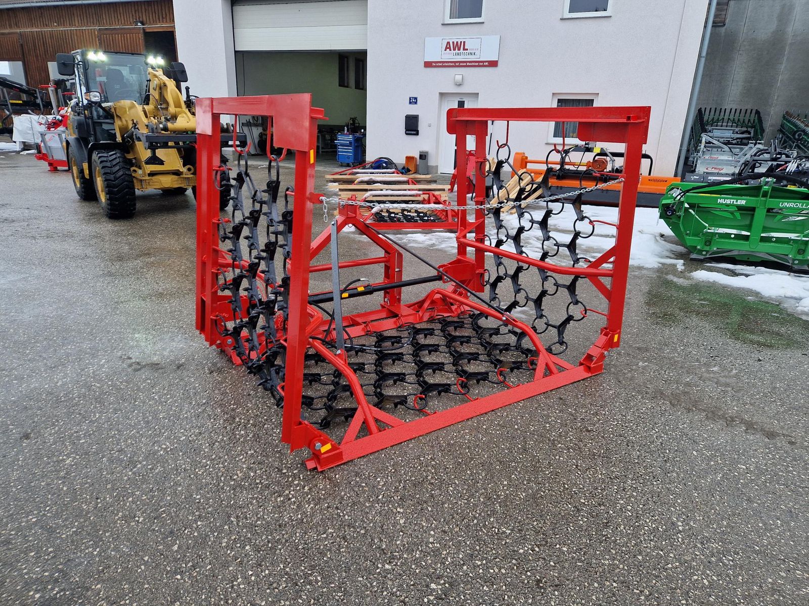 STEKRO Wiesenegge, verstärkte Ausführung, stärkeres Eggenfeld, hydraulische Klappung, mechanische Zylinderverriegelung, integrierte Gleitschuhe.