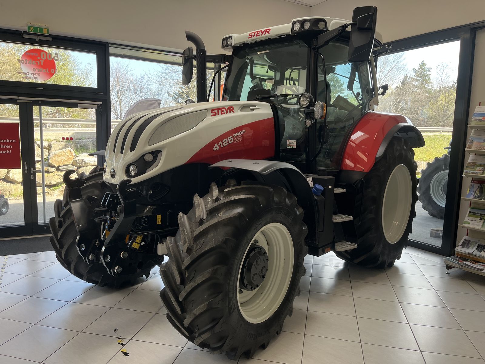 Steyr Profi CVT 4125, Nennleistung: 125 PS, 50 km/h, Stufenlosgetriebe, elektronische Parkbremse, 4 elektrische Hecksteuergeräte, Power Beyond, 2 elektrische Mittensteuergeräte mit erweiterter elektronischer Joystick, Isobus Klasse 2, Druckluftbremse, externer Druckluftanschluss, 3-fach Zapfwelle, 150 l/min Axialkolbenpumpe, pneumatische Kabinenfederung, Luftsitz, Klimaautomatik, Bluetooth-Radio, 700 Plus Monitor in der Armlehne, S-Brake, Monitorhalterung, erweitertes Vorgewendemanagement, 16 LED Arbeitsscheinwerfer, 210 A Lichtmaschine, 176 AH Batterie, Rundumleuchte links und rechts, Fronthubwerk mit 2 Leitungen, Frontzapfwelle, Frontelektrik, gefederte Vorderachse, Lenksystemvorbereitung, Bereifung: 520/60 R28 und 650/60 R38 Michelin Xeobib, Ansprechpartner: Andreas Diry