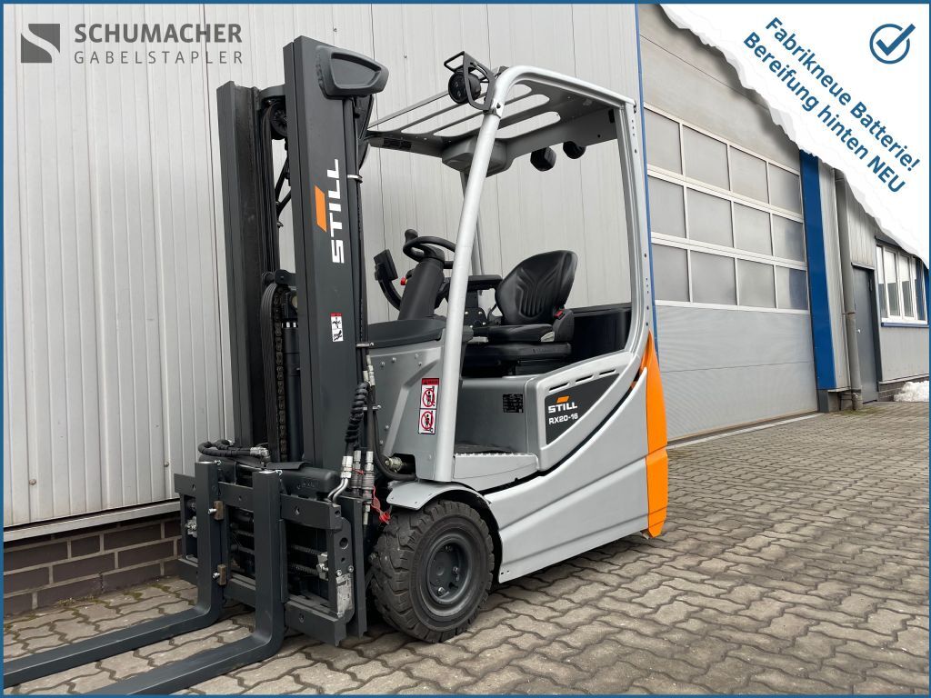 Bauart: Frontstapler / Elektro 3 Rad-Stapler, Tragkraft: 1600kg, Hubhöhe: 4320mm, Bauhöhe: 1960mm, Freihub: 1320mm, Gabellänge: 1200mm, Batterie: FABRIKNEU PzS Bj. 2025 48V 625Ah Zustand: Neu, Bereifung vorne: Superelastik Einfach 80 - 100% , Bereifung hinten: Superelastik Zwilling Neu , Anbaugeräte: Seitenschieber, Zinkenverstellgerät, Sonderausstattung: 3. Ventil, 4. Ventil, Arbeitsscheinwerfer hinten, Arbeitsscheinwerfer vorn, Safety Light, Beschreibung: Überholt, gewartet und geprüft gemäß FEM 4.004 (UVV). Completely repaired, serviced and checked.