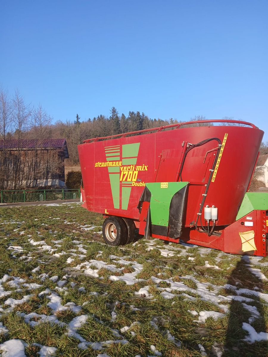 Gebrauchter Strautmann Futtermischwagen Verti-Mix 1700 Double, mit ca 17 m Volumen. Der Strautmann Verti-Mix 1700 Double ist ein robuster, gezogener Doppel-Futtermischwagen mit zwei vertikalen Mischschnecken und einem großen Volumen, ideal für mittelgroße bis große Betriebe, zeichnet sich durch eine starke Konstruktion, sowie präzise Wiegesysteme aus und bietet eine effiziente, homogene Mischung für eine große Anzahl von Kühen pro Füllung.