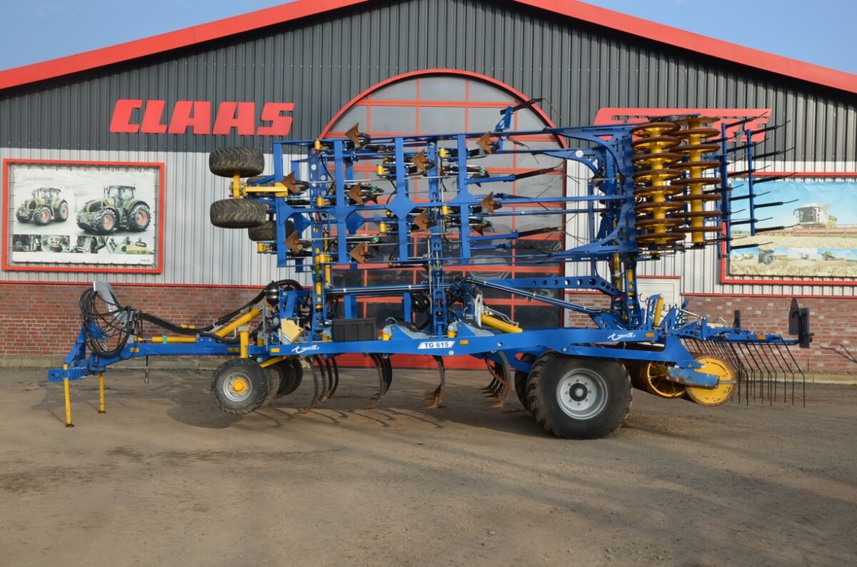 Baujahr: 2023 1 Hydraulische Steinsicherung 1 Original Treffler Hartmetall Feinschnitt-Schare KA 260-10 (35 Stk.) 1 Tandem-Tasträder 300/65-12 SG Flotation 8PR 122 A8 1 Winkelprofilwalze verstärkt mit Ringscheibe Heckstriegel 3 tlg für Grubber TG615 1 - Zinkenabstand 10cm variabel veränderbar - Zinkenträgerabstand 300mm - Zinken Ø12, mit Blattfeder 40x3 - Höhenverstellbar über Steckbolzen Traktionsverstärker 1 Hydraulischer Traktionsverstärker mit Stickstoff-Speichereinheit. Beim ausheben des Grubbers, wird die Hinterachse des Schleppers automatisch entlastet. Auch während des Arbeitens kann der Traktionsverstärker zu oder abgeschaltet werden. Die Hinterachse des Schleppers kann bis zu 1500Kg belastet werden. 1 2 Rückscheinwerfer links und rechts 1 Randscheibensech mit verstellbaren Räumblech, klappbar 1 Hydraulische Tiefeneinstellung, am Heck 1 TÜV Gutachten für 40km/