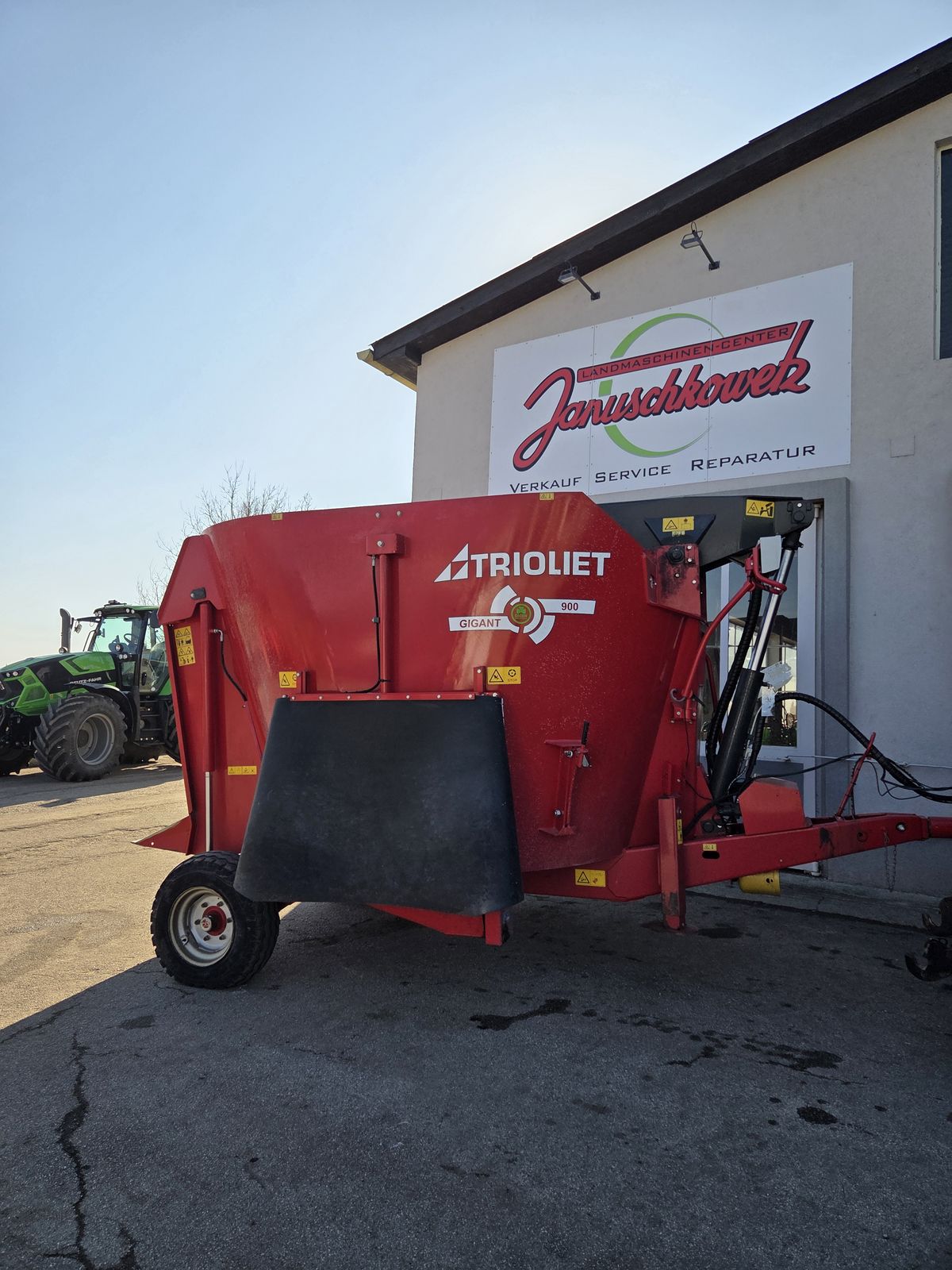 Gebrauchtmaschine Gigant 900 - sofort einsatzbereit - elektrische Wiegeeinrichtung - hydr. Stützfuß - Gummischutzklappen Dosierschieber AUSRÜSTUNG: • Eine Twin Stream Vertikalmischschnecke (15mm Schnecke/18mm Dosierschaufeln) • U-förmiges Schneidschild (Typ Messer) • Elektrische Bedienung • Weitwinkelgelenkwelle • In Höhe einstellbare Deichsel • Zugdeichsel für Obenanhängung (Typen Gigant 700 und 900) • Beidseitige hydraulische Dosierschieber mit Stahlschutzklappen • Hydraulische Bremsanlage mit Feststellbremse (Typen Gigant 700 und 900), 1x e.w. erforderlich • Zwei Einzelräder • Trioform Schneidmesser kurz Preis gilt für aktuellen Zustand! Angebot freibleibend, Irrtümer, Änderungen und Zwischenverkauf vorbehalten! Das Verkaufsteam der Fa. Januschkowetz zeigt Ihnen das Gerät / Maschine gerne und bittet um Terminabsprache zwecks Besichtigung bei uns am Betrieb.