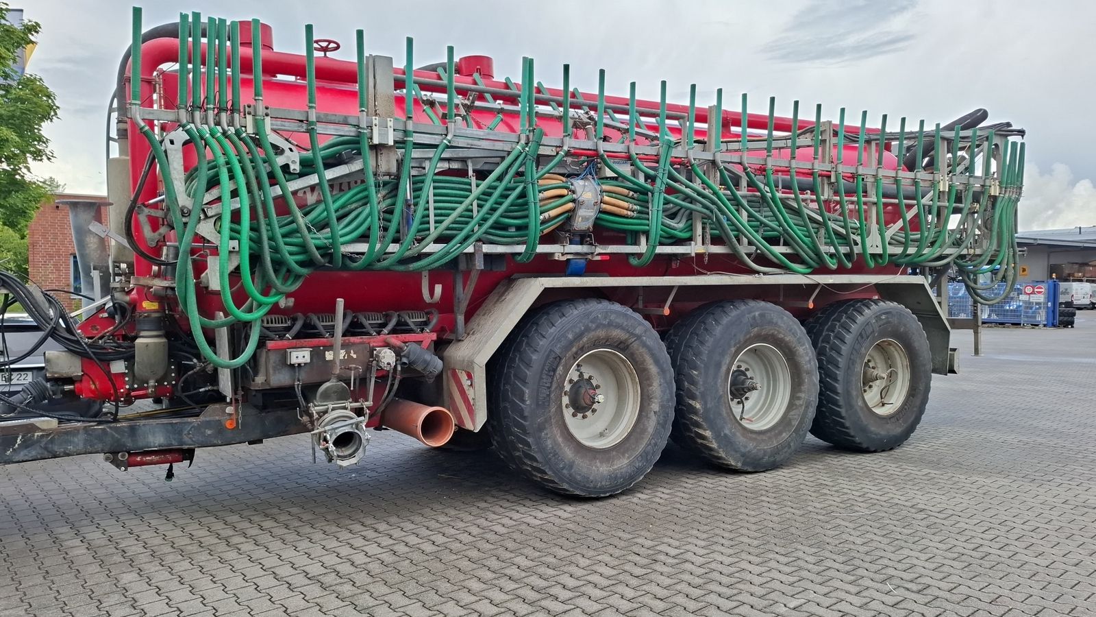 24.200 ltr., Vogelsang Gestänge 30m, Schleppschlauch, Hydr. Klappbar, Tridemachse, Zwangslenkung, Reifendruckregelanlage mit Zusatzkompressor, Vogelsang Pumpe 6 cbm, Zentralschmieranlage, WieTaCon Steuerung, Verteiler Typ ECL48, K80´er Anhängung, Hydr. Stützfuß, Ansaugung 10 Zoll links und rechts, Steinfangbehälter, Rotor Cut RC 10.000 MXL, Vorbereitung, Frontsaugarm, Topzylinder, Prallteller, Hydr. Hubwerk, Ausbringmengensteuerung, 650/65 R30.5 20%.