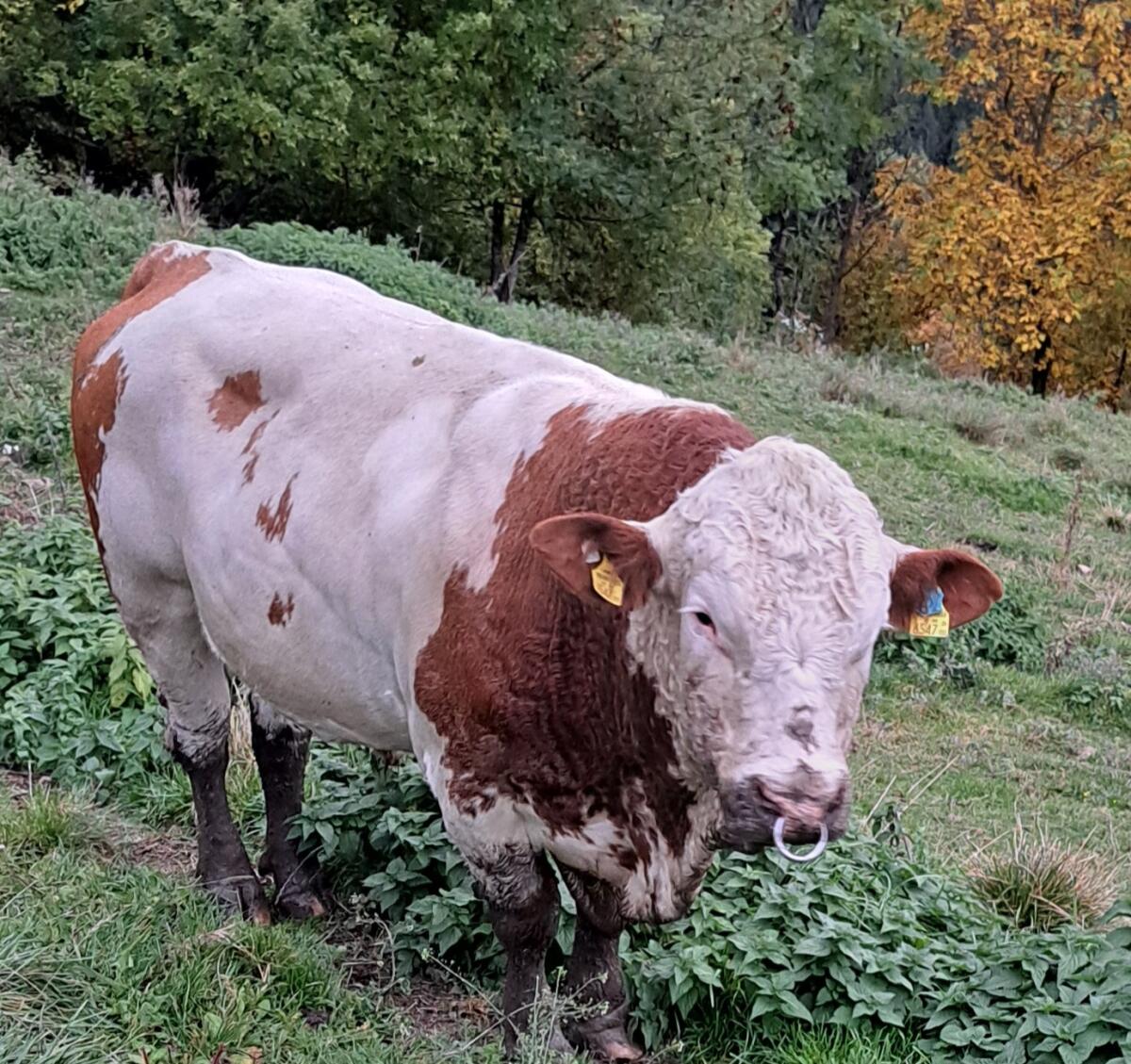 Deckstier, FV, reinerbig hornlos, sehr guter Charakter, weidegewohnt, routinierter Springer. Cattle market Simmental hornless cattle