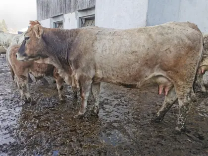 Selling a first-calf cow with 32-33 kg of milk. The cow has a very good udder, very good conformation, and good milk components. She is used to robotic milking and m