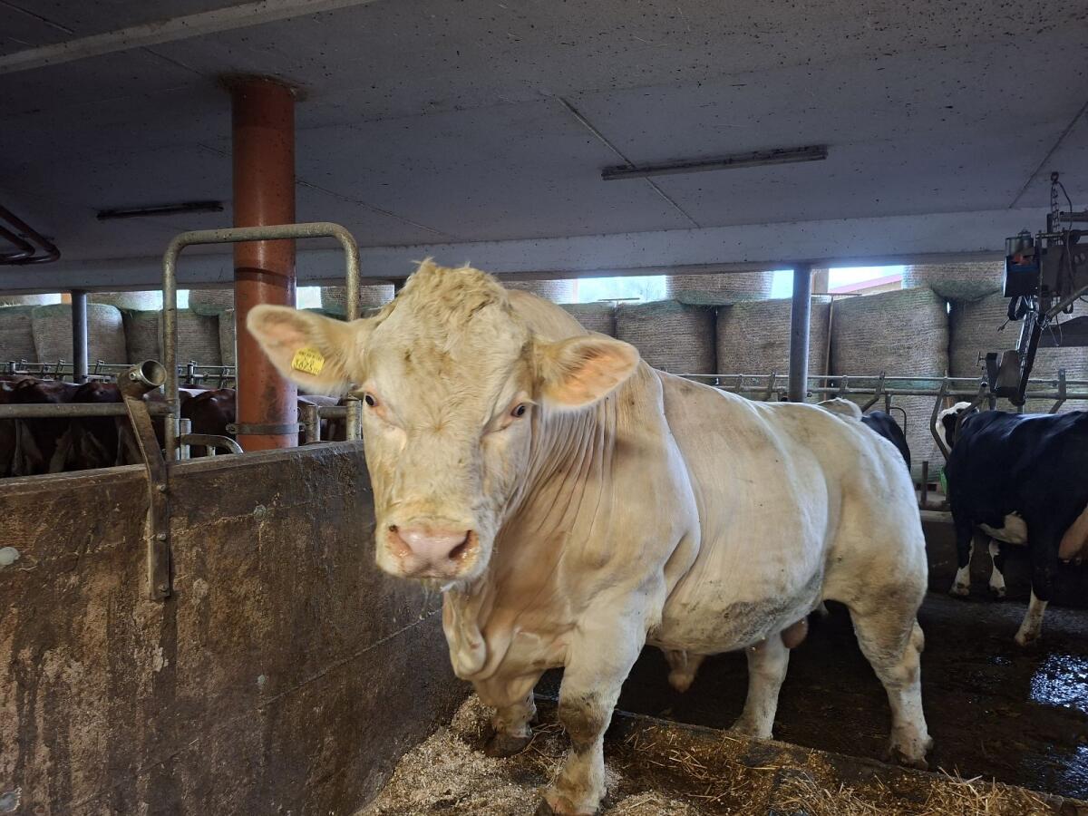 Verkaufe sehr gutmütigen Charolais Deckstier, ca. 4, 5 Jahre, Gewicht 1.400 - 1.500 kg. Eventuell auch für Schlachtung. Cattle market Charolais cattle