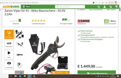 Verkaufe Zanon Profi-Akkuschere Viper SV45 inkl. DRIVE 350S 3, 2 Ah / 50 V Akku. Profigerät schneidet bis zu 45 mm Astdurchmesser. Ich habe die Schere als Vorführgerä