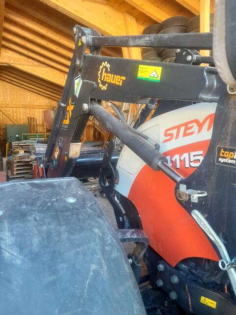 BIG LIFT Frontlader mit Konsole, mechanische Ausklinkung, Schaufel 1,2 m breit, Schwingenbreite Mitte zu Mitte 100 cm, Aufnahmenbreite am Anschlag vorne 72 cm, Aufnahmelänge von Bolzen zu Anschlag 90 bis 95 cm, passend zu Steyr 955 A.