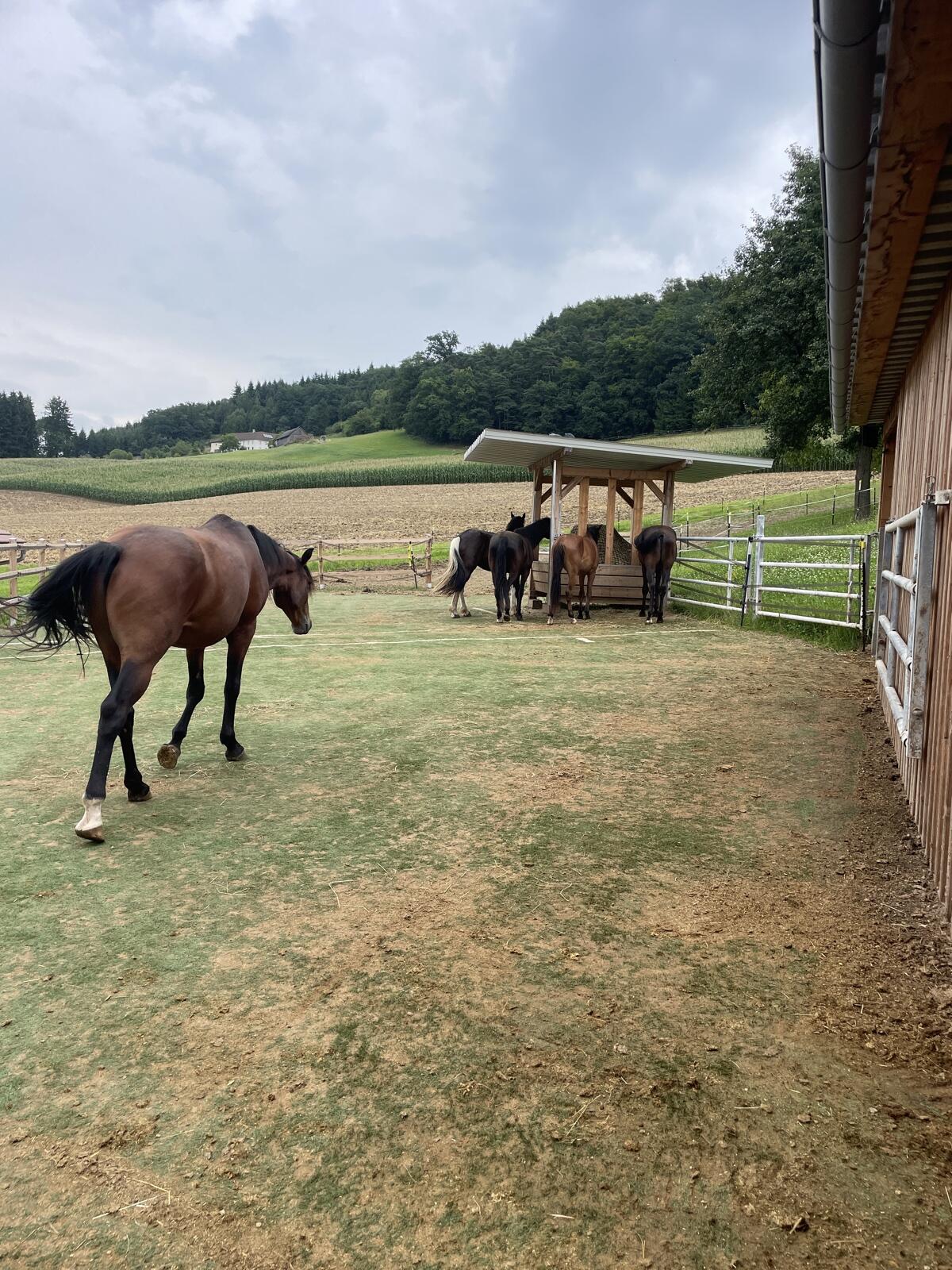 Oberösterreich/4221 Steyregg, vergeben ab Herbst wieder Aufzuchtsplätze in unserem Offenstall in Steyregg für Wallache/Hengste. Gruppe von ca. 5 Pferden, am liebsten alles Absetzer oder Jährlinge, welche dann 3-4 Jahre gemeinsam aufwachsen. Stall mit Liegebereich, mit Gummimatten/Strohpellets eingestreut, angrenzend befestigter Paddock mit Kunstrasen, große Wiesenkoppeln, 24/7 zugängliche Heuraufe mit Heu aus eigener Produktion, ruhige Lage, dennoch täglicher Kontakt zu Traktoren, anderen Tieren, & Co. 1-2 x täglich misten. Monatlich € 250,- inkl. täglich Hafer & hochwertigem Mineralfutter. Hufschmied kommt regelmäßig und kann auch von uns übernommen werden. Näheres gerne persönlich.