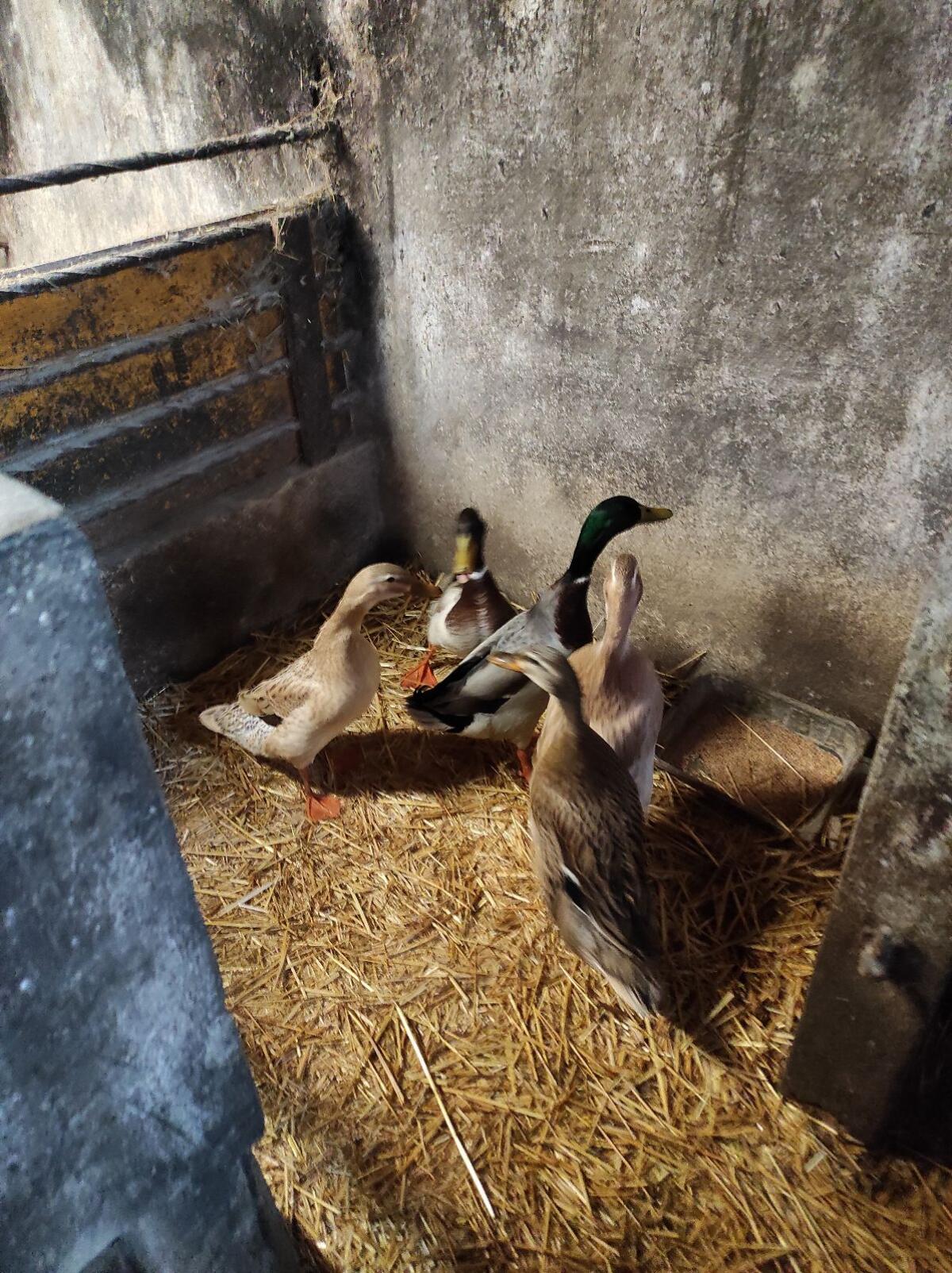Zweijährige Enten, brave Schneckenfänger, einer der Erpel ist zu vergeben und 3 der Enten - nicht die weiße. Sind Freigänger und kommen jeden Tag zurück in den Stall.