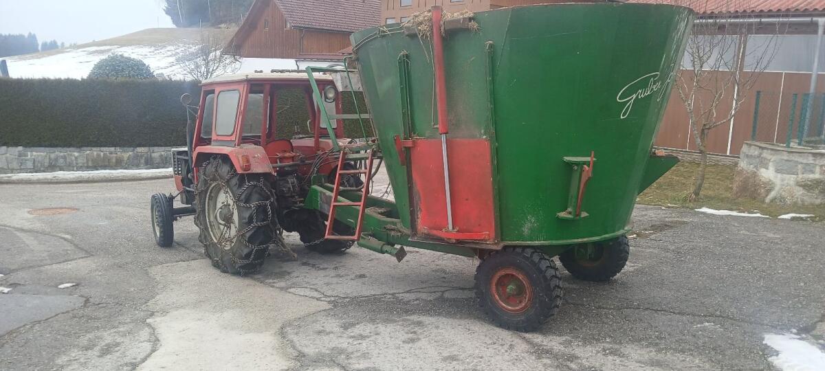 Futtermischwagen Eigenbau ca. 8m³, massiv gebaut, Behälter ca. 15 mm dickes Blech, Schnecke ist auch noch gut. Austragung beidseitig. Getriebe ist eine LKW-Achse (Man/ÖAF) mit Außenplanet. Hat einen Defekt, dreht nur im leeren Zustand, vermutlich der Ausgleich oder die Muffe von der Sperre kaputt.