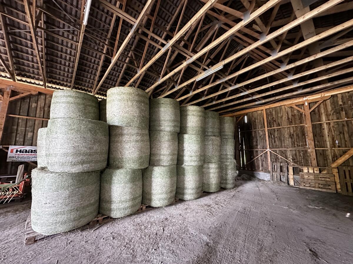 Heurundballen Dm. 130 cm, Gewicht 280-320 kg, 1. & 2. Schnitt 2025, 1A Qualität, trocken auf Paletten in Halle eingelagert. 1. Schnitt Heu: 73 Stk., 2. Schnitt Grummet: 21 Stk. Sonderpreis. Zustellung im Raum Gailtal, Villach, unteres & oberes Drautal auf Anfrage möglich.