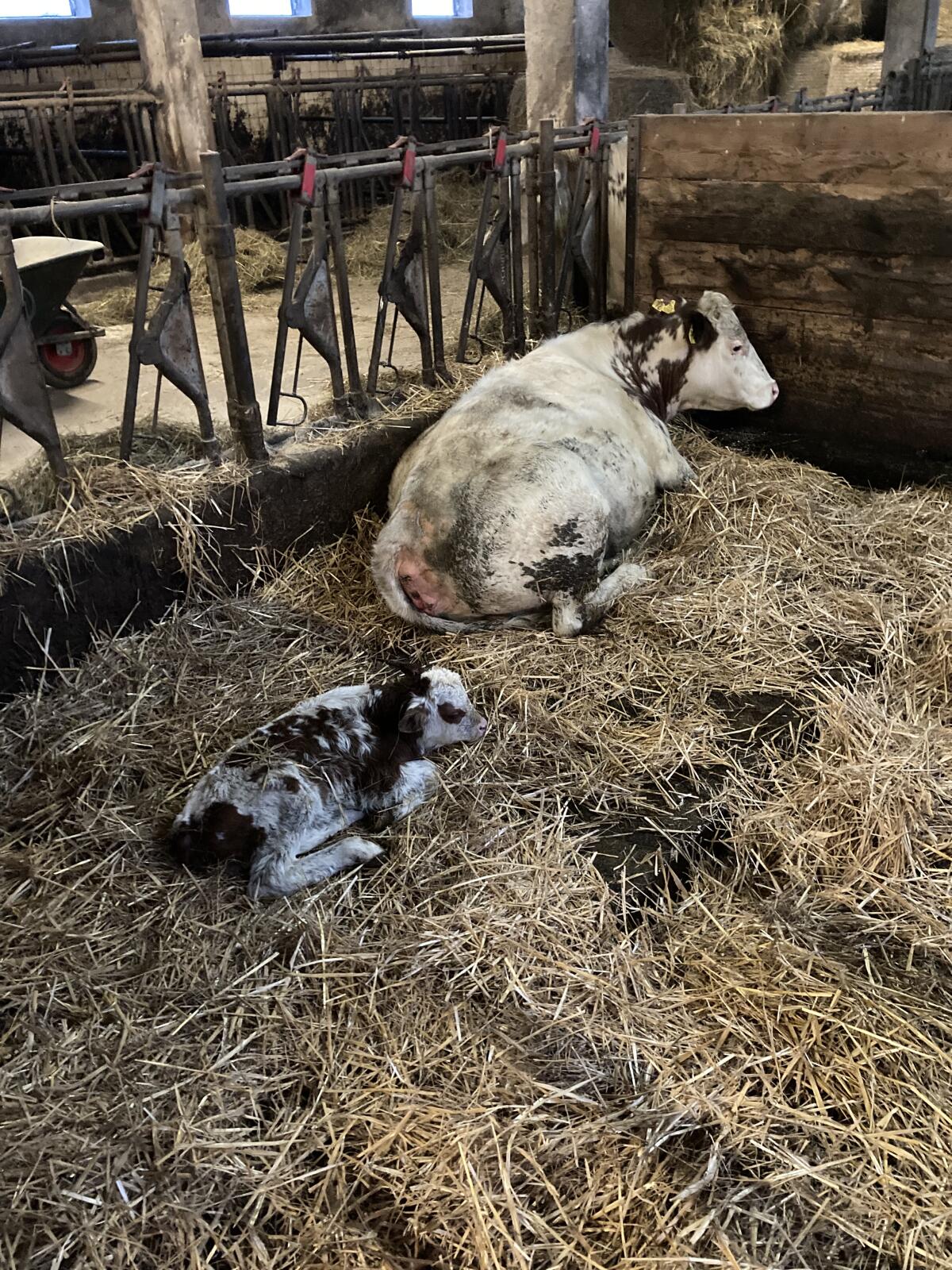 Jungkuh mit Kalb, FL x WBB Kuh mit Kalb, Standort Sinabelkirchen/Steiermark.