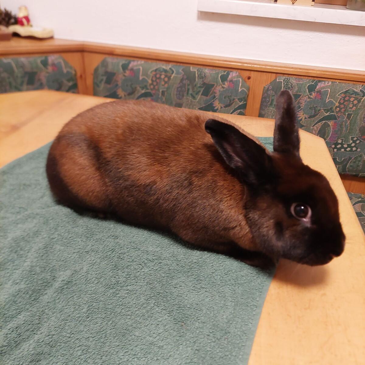 Top Zuchttier 96,5 Punkte, Satin Thüringer Häsin vom Jänner 2025, kann mit blutfremdem Satinrammler gedeckt werden, ruhiges Tier mit sehr guten Anlagen, was Typ, Form, Fell und Farbe anbelangt.