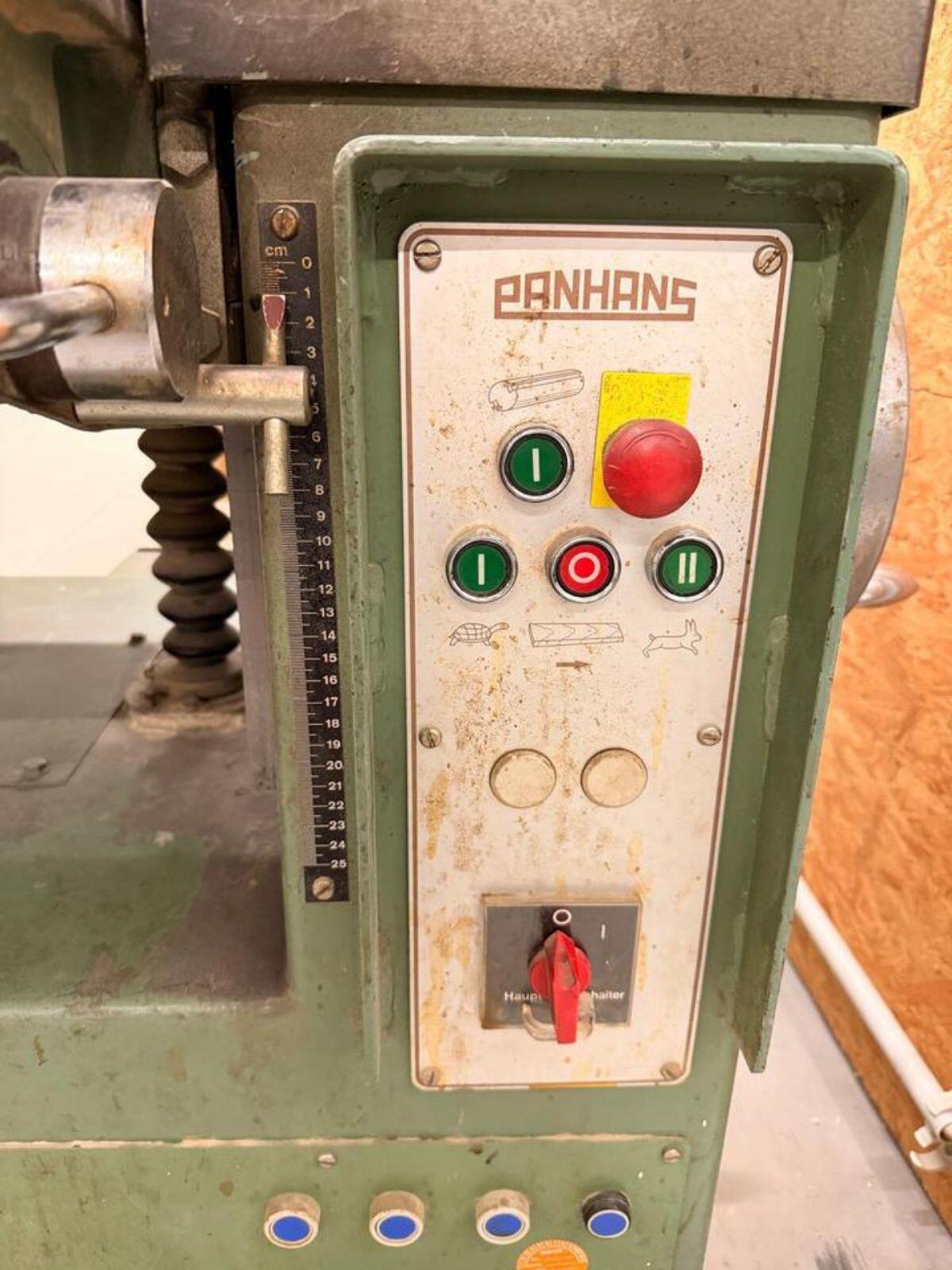 We are selling a Panhans type 425 thickness planer. The machine is fully functional and can be viewed on site. Panhans thickness planer, type 425, built in 1980, workshop tested, planing width 510 mm, max. planing height 250 mm, table length 900 mm, cutter shaft diameter 125 mm, cutter shaft speed 5,000 rpm, motor 5.5 kW, feed 7 + 14 m/min, space requirement approx. 1,000x1,100 mm, weight approx. 650 kg. Collection of the machine from our address is preferred, but shipping is possible for an additional charge of €80.