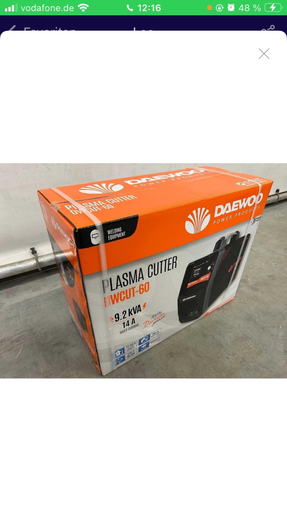 Marke: Daewoo, Typ: DWCUT60, Max. Schneiddicke: 20 mm, el. Anschluss: 380 V, Maschinengewicht: 15 kg, Abmessung L: 535 mm, Abmessung W: 210 mm, Abmessung H: 380 mm, Weitere Informationen: Nennleistung: 9,2 KVA, Nennstrom: 14 A, Spannung ohne Last: 256 V, Ausgangsstromanpassung: 20-60, Nennausgangsspannung: 104 V, Maximale Schnittdicke: 20 mm, Zyklischer Dauerfaktor: 60 %, Effizienz: 70 %, Isolierungsqualität: F, Schutzklasse: IP21, Arc-Start: Kontakt, 6094. Neu und unbenutzt.
