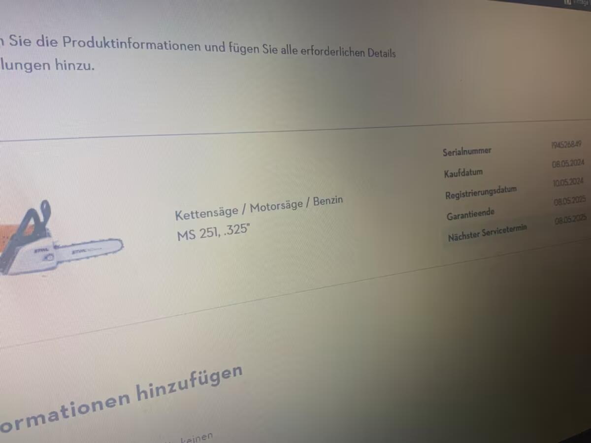 Abholung in Graz bevorzugt, versicherter Versand österreichweit € 14,-. Neue Stihl MS251 mit Schnittlänge 40 cm mit der neuen Light Kettengarnitur. Wurde im Mai 2024 bei Stihl angemeldet, jedoch nie benutzt, nicht betankt - neu. Privatverkauf - ohne Garantie, Rechnung, Umtausch, Rücknahme usw.